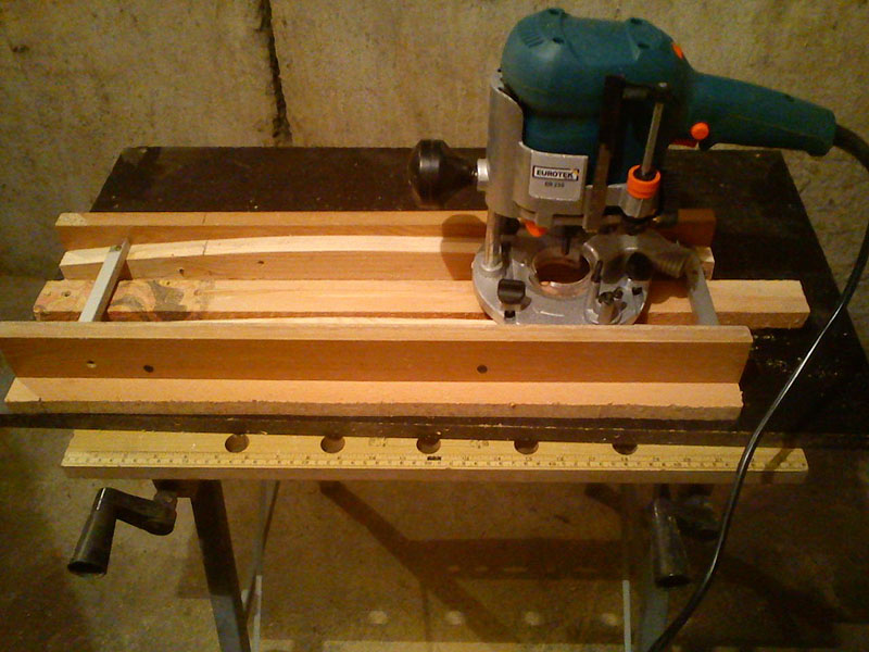 Zrobiłem dzisiaj szablon. oczywiłcie wg planów telecastera. Będzie on jeszcze ulepszony gdyż muszę dorobię odpowiednie uchwyty do gryfu oraz szablony do wiercenia otworów pod regulację. Szablon działa, łuk wyfrezowany, zmierzony - jest jak trzeba. Poniżej zdjęcia mojej konstrukcji. Teraz pozostaje odpowiednie przymocowanie gryfu, kupienie frezu 6mm i jechane. mam nadzieje, że nic nie spartolę. mam zamiar poęwiczyę jeszcze na twardszych kawałkach drewna zanim zabiorę się za gryf. Muszę wyczuę ta maszynkę dokładnie
