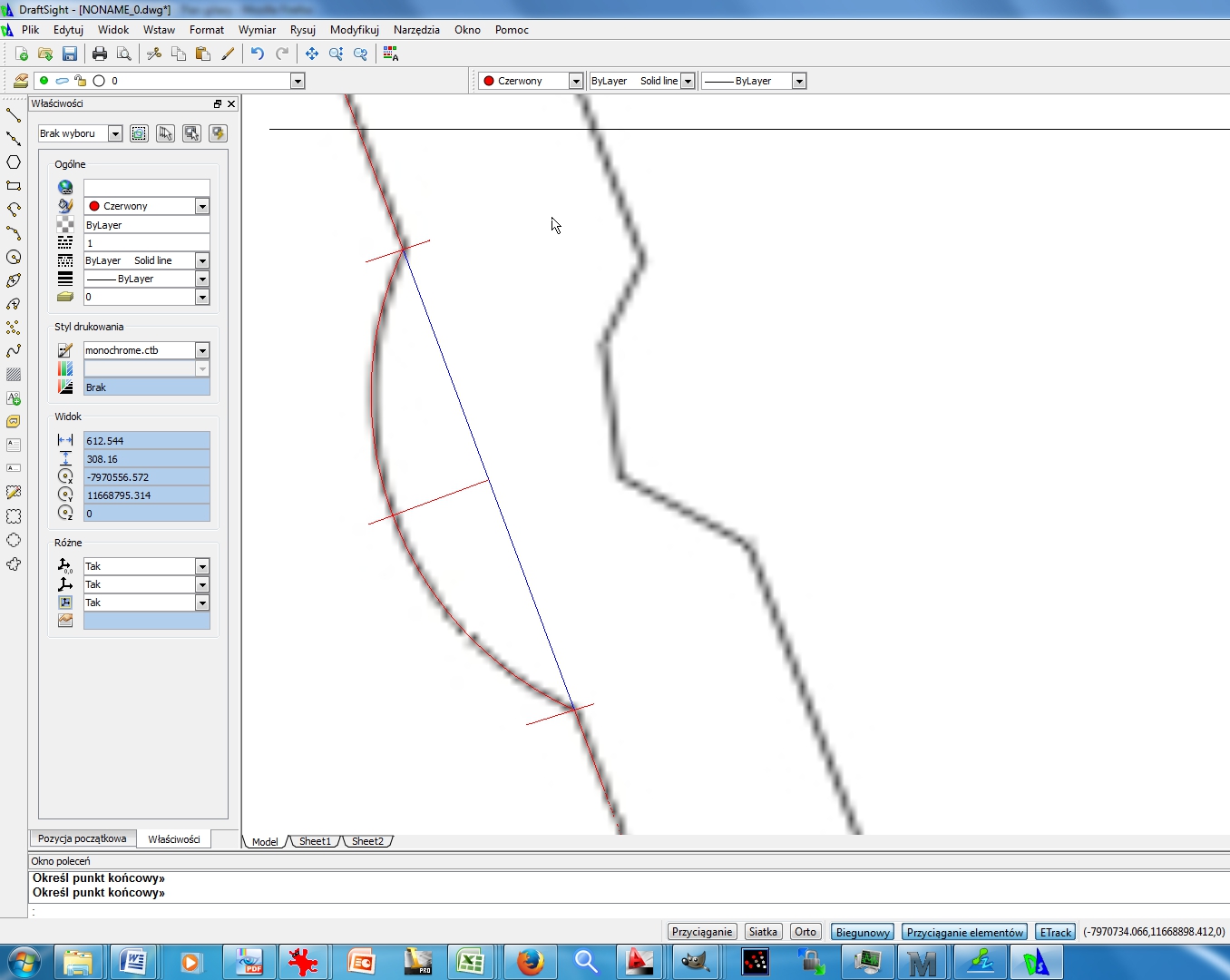 6) Obrysowuję polilinię cały kształt. Polilinia ma możliwołę zmiany charakteru z prostej na łuk. Zmian dokonuje się poprzez klikanie podkrełlonych liter (L - linia) (ł- łuk) po rozpoczęciu rysowania polininię. Gdy rysujemy łuki, można zmienię kierunek promienia (potrzebne było w przypadku łuku wklęsłego). Rys. 7
