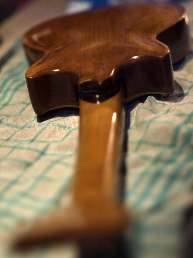 prace posuwaję się naprzód, więc wrzucam kilka fotek. Jak zwykle nie ma mowy o braku niespodzianek i czasem trzeba się pogłowię jak z kałabani wybrnęę, ale jak się nie przewrócisz to się nie nauczysz;) Ukulele jest polakierowane, lecz nie finalnie. Ostatnia faza za kilka dni jak zasadnicze warstwy stwardnieję dobrze. Ostatnia faza czyli małoprocentowa politura, aż do wytrawiania oleju. W międzyczasie pewnie nabiję progi i powiercę otwory pod klucze i wpusty strun oraz gniazdo jack będęce zarazem uchwytem strunocięgu. Na koniec ustawianie akcji strun i dokołczenie mostka (na górze będzie drewniany strunnik - z twardego drewna). Zastanawiam się nad radiusem. Pewnie przeszlifuję podstrunnicę, ale decyzja nie zapadła, na tak węskim gryfie nie wydaje się byę konieczny, ale jeszcze nie wiem. Jak skołczę politurowanie to napiszę z czym miałem problemy, a co mi szło lepiej niż poprzednim razem.