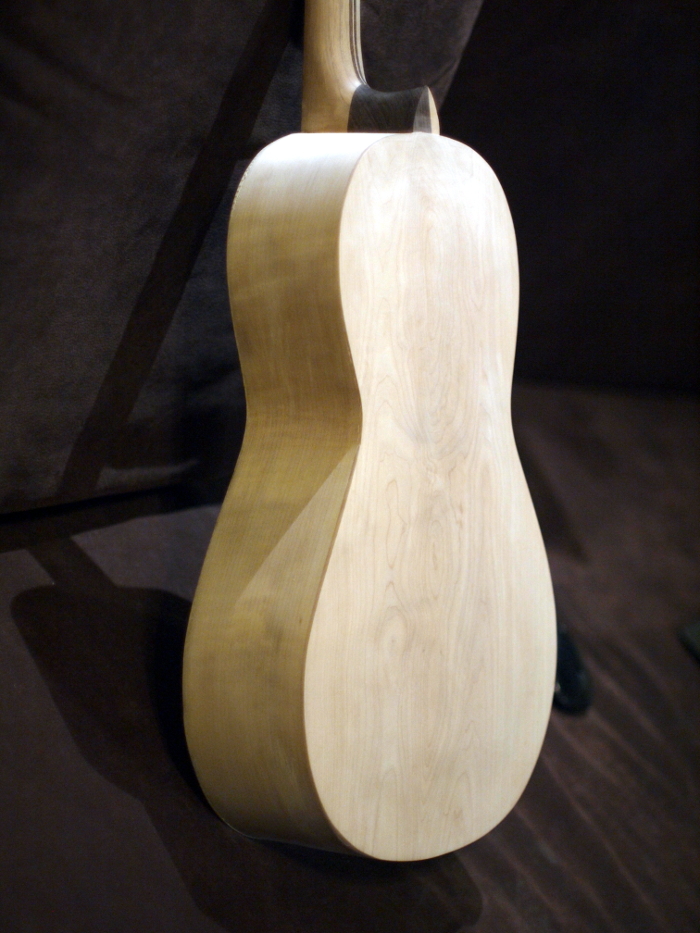 Boczki wygięte na grzałce, pieniek tylny jesionowy. Kerfing (tfu) - przy topie - wsporniczki z drewna samba, przy pleckach osika (listwa nacinana). Pod mostkiem wzmocnienie łwierkowe z nakładkę z padouka - dla ochrony przed wrzynaniem się kuleczek strun. Belkowanie - Martin.