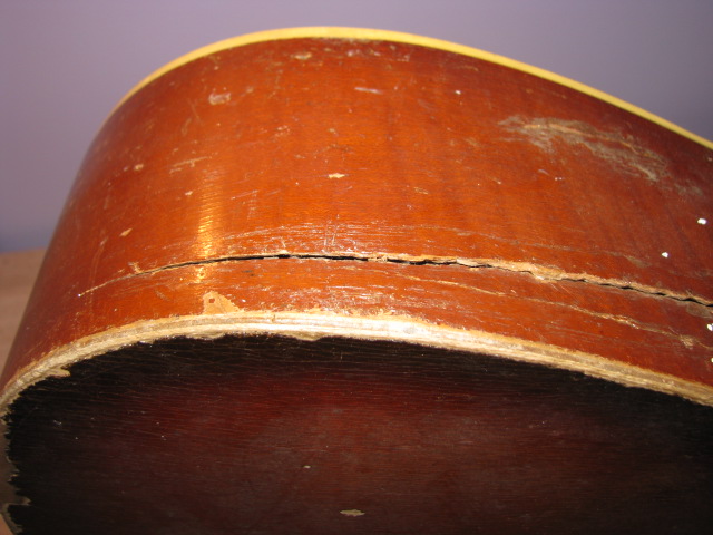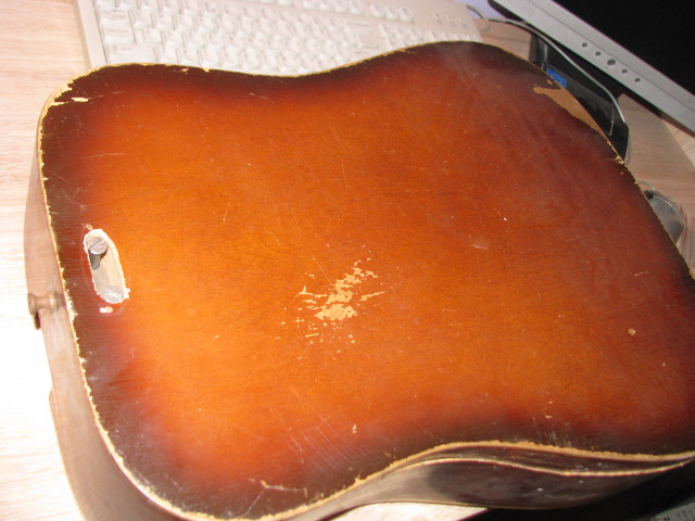 Dostałem od znajomego gitarę pokazanę na fotkach, on chciał ja wyrzucię, a mi się jej żal zrobiło. Dawno temu miał ja zamiar wyremontowaę i zakupił nawet podstrunnicę(co prawda z innę menzurę) ale ostatnio mu się odwidziało, ze względu na pęknięty/rozbity bok.