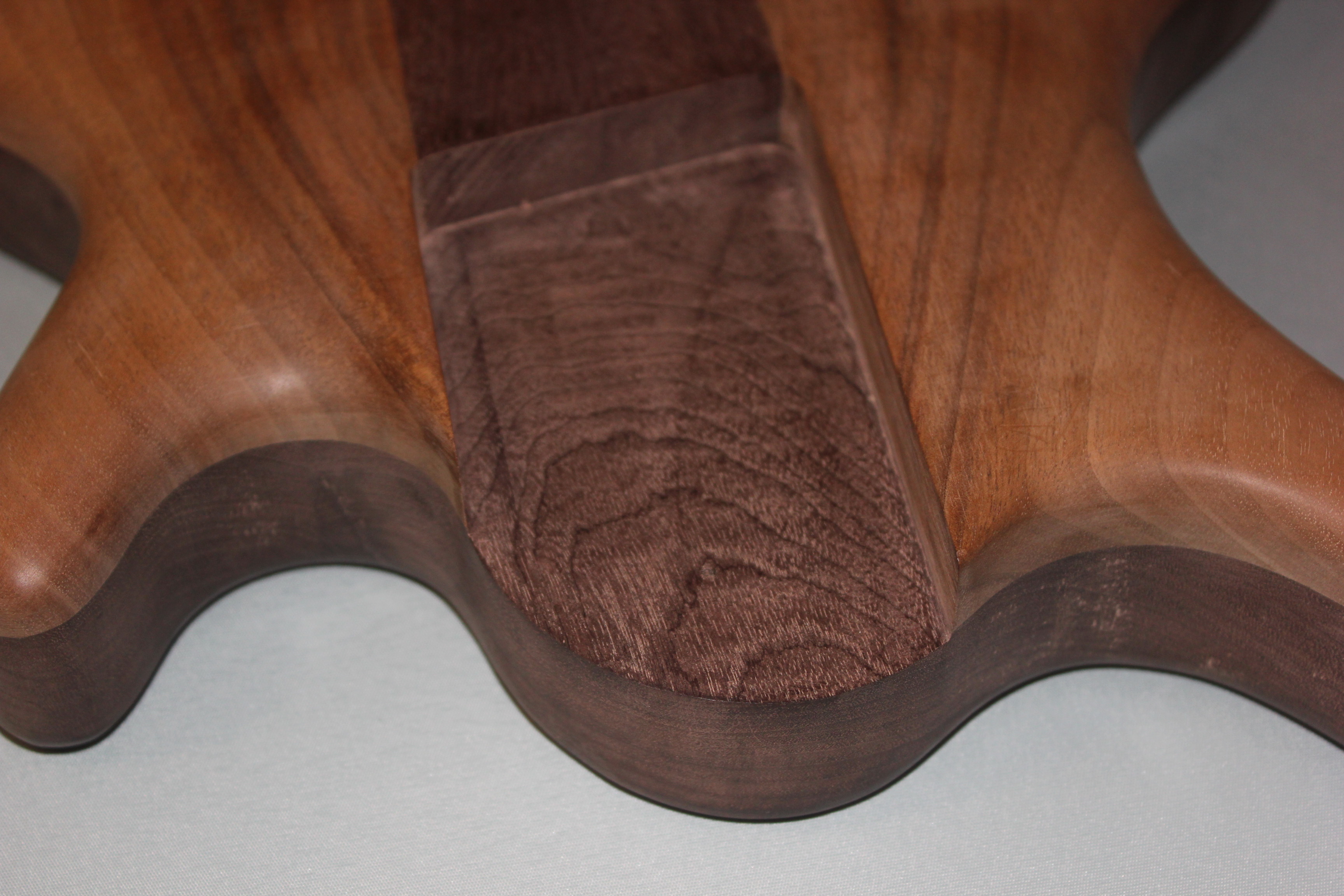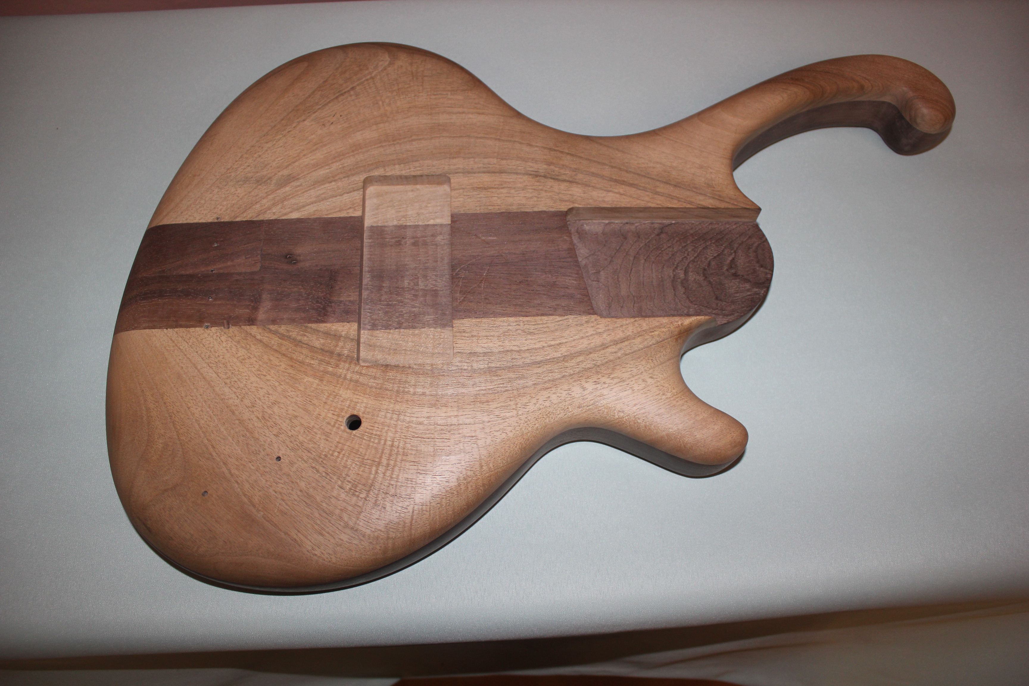 Konstrukcja przód i tył klejone z jednej deski linie klejenia nie pokrywaję się. W orzechu amerykałskim zostały wyfrezowane komory dla zmniejszenia wagi instrumentu i poprawienia jego akustyki z wagę zadziałało, reszta jeszcze się okaże ;) połęczenie gryfu z deskę na 6 łrubach z tulejkami dociskowymi, łruby wkręcane w gryf przez deskę będę tylko przechodzię.