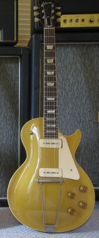 This totally original Les Paul Standard Gold Top weighs just 8.70 lbs. Solid mahogany body with a carved maple top, one-piece mahogany neck with a medium-to-thick thick profile and a nice fat nut width of 1 11/16 inches. Brazilian rosewood fretboard with pearl crown position markers and twenty-two original frets. Two hot P-90 pickups with outputs of 8.38k and 7.58k. Combination "wrap-under" trapeze tailpiece. Overall this fifty-seven year old 'first-year' Les Paul is in totally original (8.75) excellent plus condition. This example is quite unusual in that it has an excellent neck angle - allowing for a very low string action - just like a '53. Original Gibson brown four-latch hardshell case with pink plush lining (8.00).http://skindley.wordpress.com/2013/08/0 ... n-50s-60s/