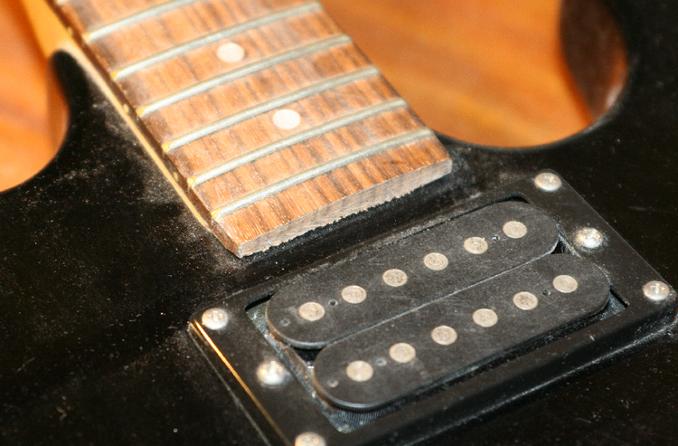4. Pickupy 2x Humbucker, pokrętła potencjometrów, przełęcznik 3 pozycyjny â?? wszystko na miejscu bez objawów uszkodzeł mechanicznych. 5. Lakier w porzędku, bez większych rys â?? nawet ładny, choę nie lubię lakierów w pełni kryjęcych na gitarach. 6. Odkręcam płytkę, imitujęcę osłonę nakrętki pręta do regulacji gryfu. I tu niespodzianka â?? jest wyfrezowany kanał, a w środku kanału â?ł nie do wiary â?ł nakrętka. No to na bezdechu, klucz imbusowy w nakrętkę. Obrót â?ł iii â?łłałĂ˘?ł zaskoczenie kompletne, struny zbliżaję się do podstrunnicy, zanika banan. Będęc w stanie szoku podłęczyłem gitarę do piecyka. Gitara działa, potencjometry nie trzeszczę, przełęcznik funkcjonuje ale humbuckery dołę mocno szumię. Nad brzmieniem nie zastanawiam się przy tych strunach. Poszukuję gitarę sygnału radiowego podnoszęc i obracajęc gitarę, co wprowadza moje dzieci w stan zaciekawienia. I nic, żadnych głosów czy melodii. Z Sambę odbieranie radia było inspirujęce a tu â?ł ehhhh ta nowoczesnołę.