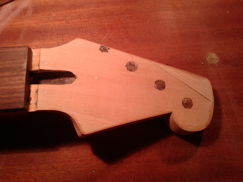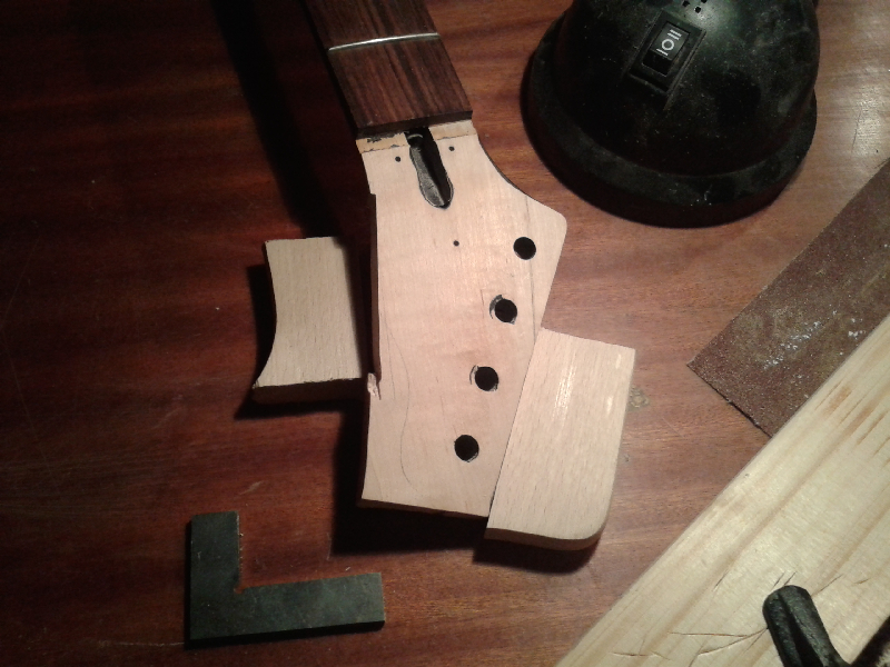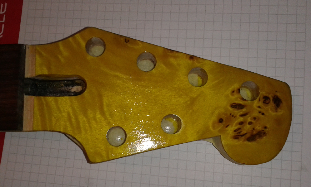 Rysunek i obciecie, docięcie, wyrównanie szlifowanie oraz klejenie. Krawędęšłgłówki dostała klonowę okleinę ze względu na widoczne rożne odcienie doklejek. Po zmianach kształtu wyględa to tak. Proporcje poleciały i niekoniecznie w dobrę stronę