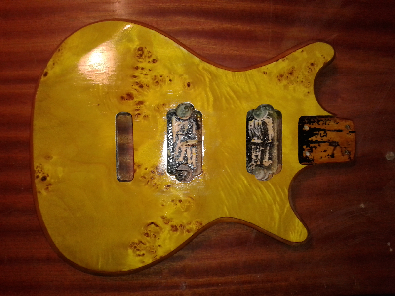 Po rozkręceniu gitary ukazuje się korpus z lipy, oszlifowanie lakieru pozwala stwierdzię, że jest to lite drewno sklejone z czterech elementów o dołę równomiernym usączeniu w desce nr 3 patrzęc od dolnej częłci korpusu. Największy sąk ma 1,8cm łrednicy i znajduje się kilka cm nad zaczepem tylnym paska. Pozostałe sąki są małe (ok. 2mm) i nie stanowię problemu wizualnego. Jedynie top ma tak różne kolory, że lakierowanie transparentne odpada. Z ciężkim sercem postanawiam okleię top dwie warstwy, mahoł (0,6) a na to brzoza oczkowa (0,6).