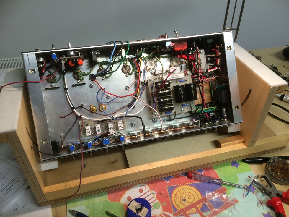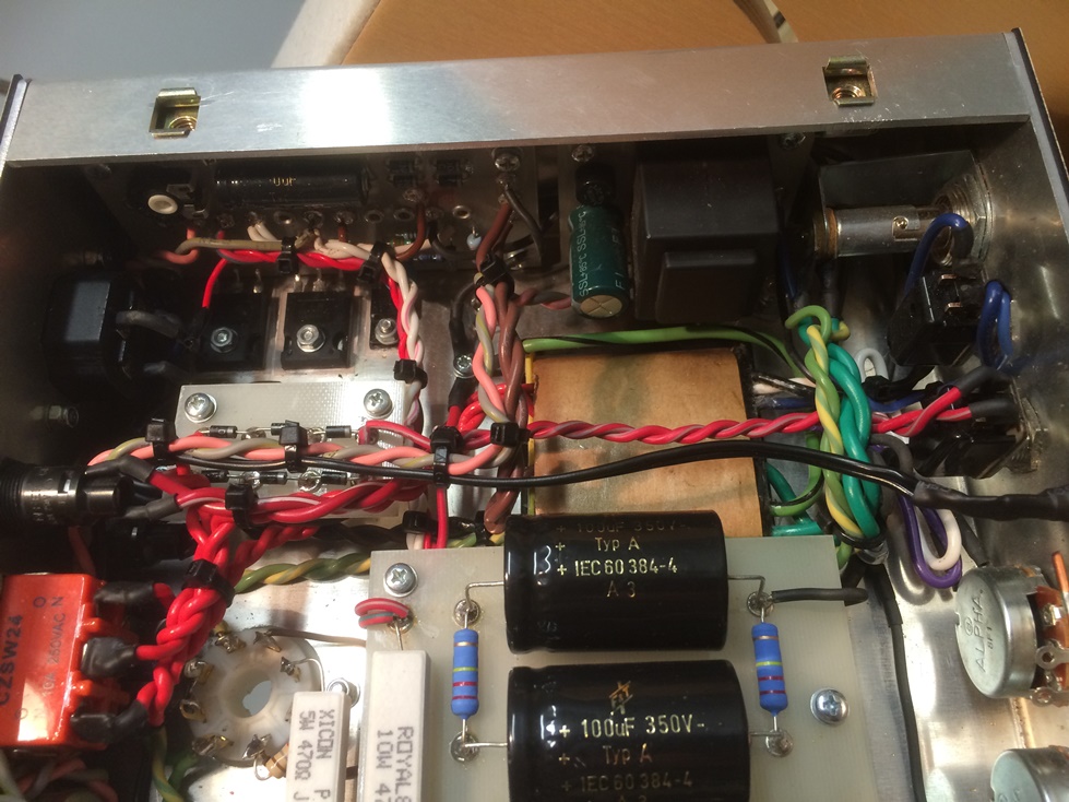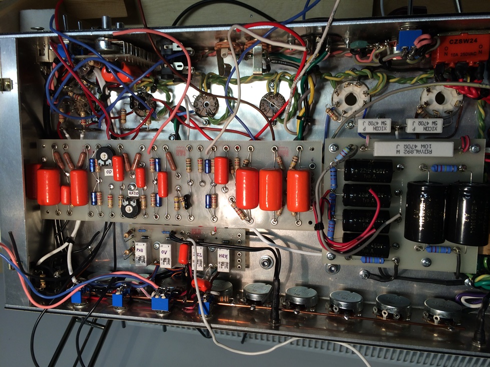 Potencjometr z tyłu obudowy pozwala ustawię mi moc wzmacniacza (skala od kilku watów do 44W) Dzięki temu mogę dostosowaę moc do potrzeb nie degradujęc brzmienia. Sterowanie to pozwala mi sterowaę napięciem anodowy w zakresie 0-450V wraz z napięciem siatki oraz biasu. Układ zbudowany na tranzystorach mosfet.