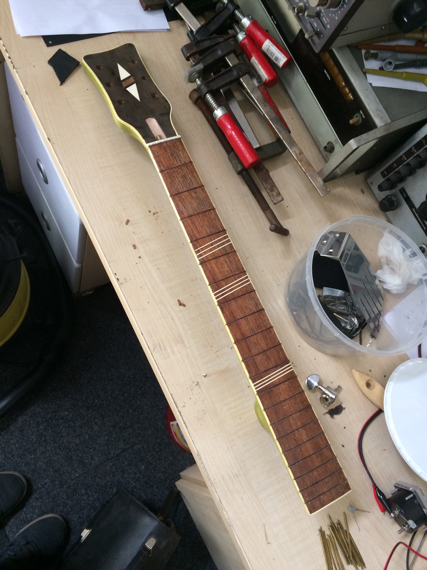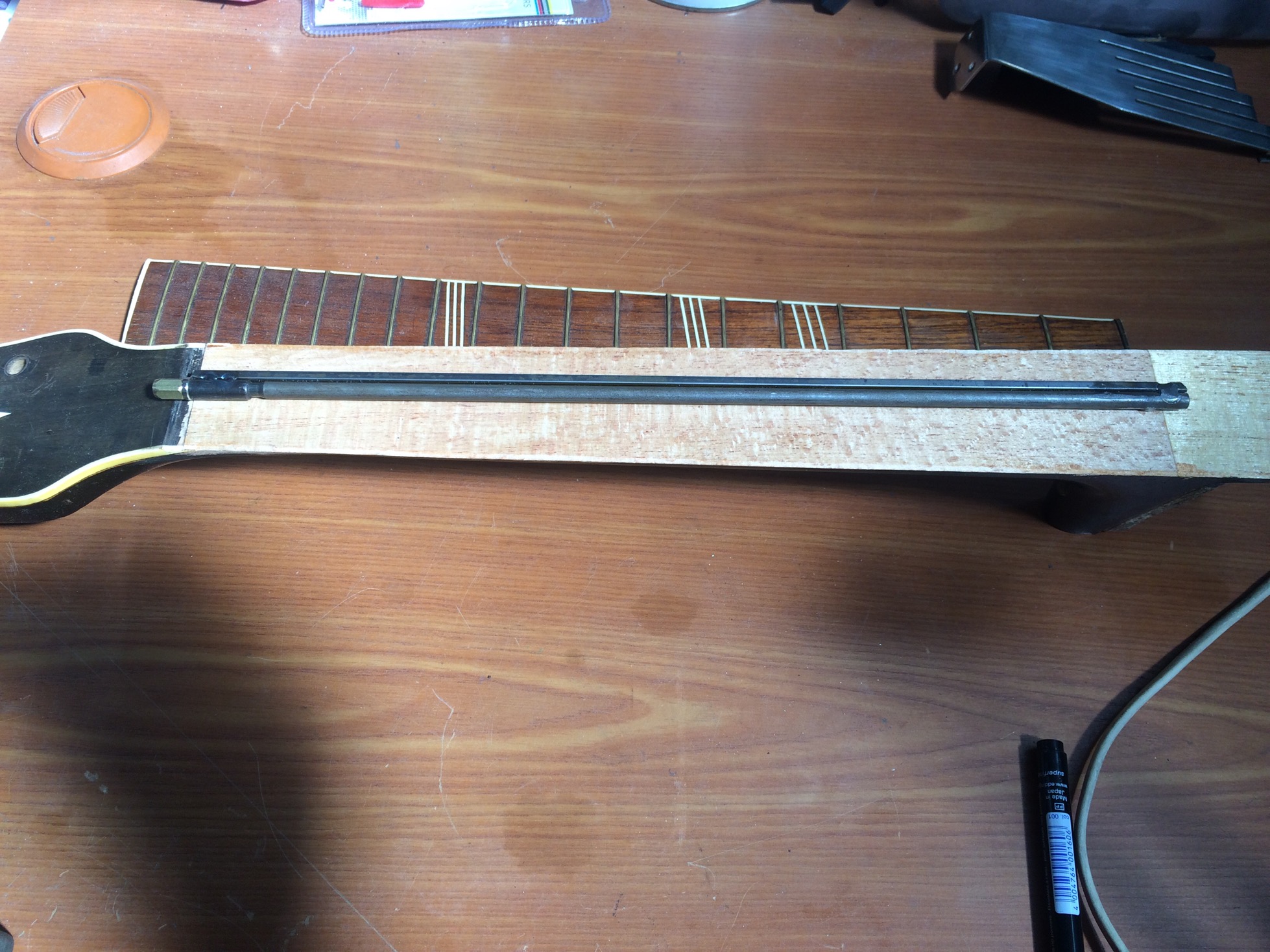 Narazie na tym pozostało czekam na pręt napinajęcy i zastanawiam się jak wyfrezuję rowek na pręt, oraz jakiego kleju używa się do klejenia podstrunnicy.