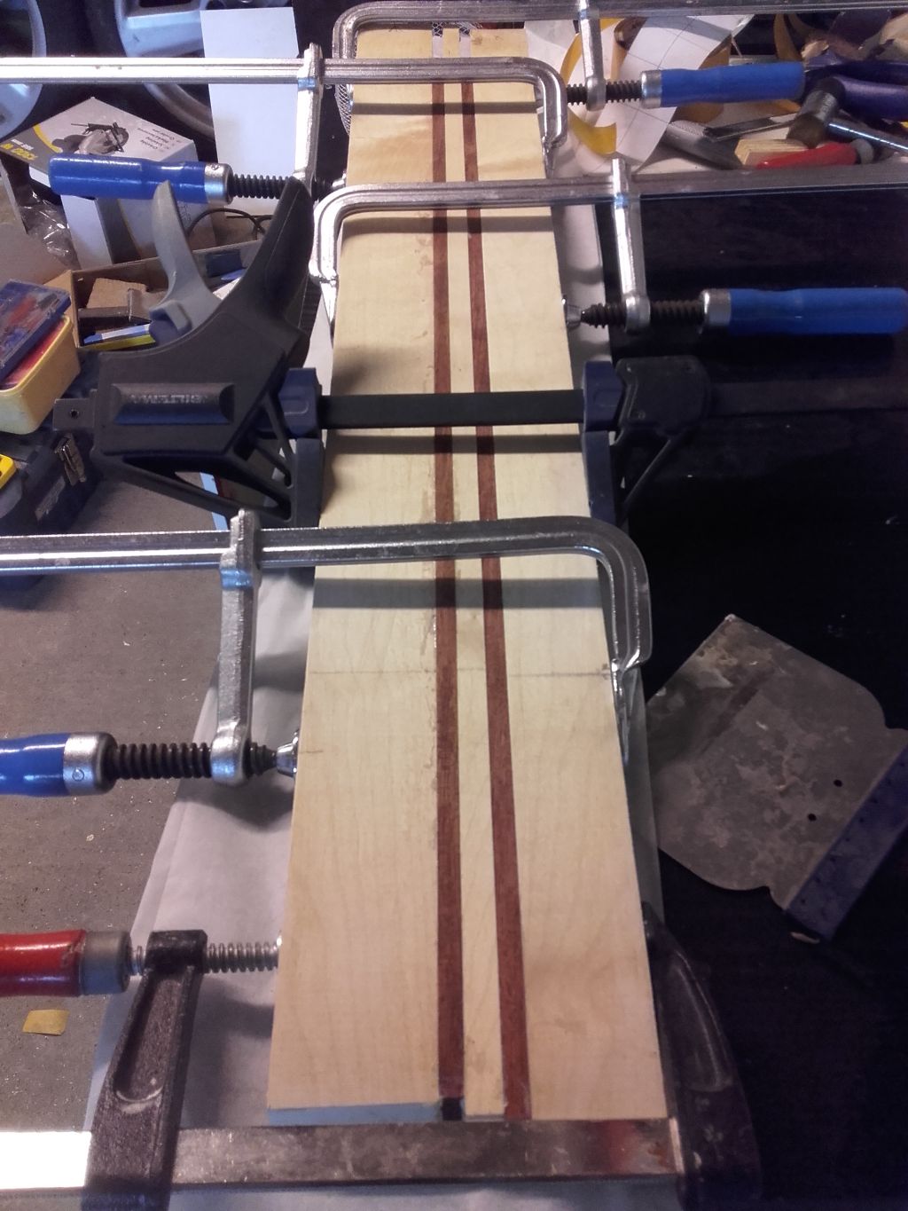 Równanie krawędzi.Dwie częłci topu złożone częłcię wewnętrznę do siebie, papier łcierny przyklejony do profilu aluminiowego. Po równaniu przed klejeniem Na jednej częłci topu widaę braki, które po sklejeniu zamierzam wypełnic epoxy lub klejem zmieszanym z trocinami. Top oparty na podkładkach i listwa dociskęca.