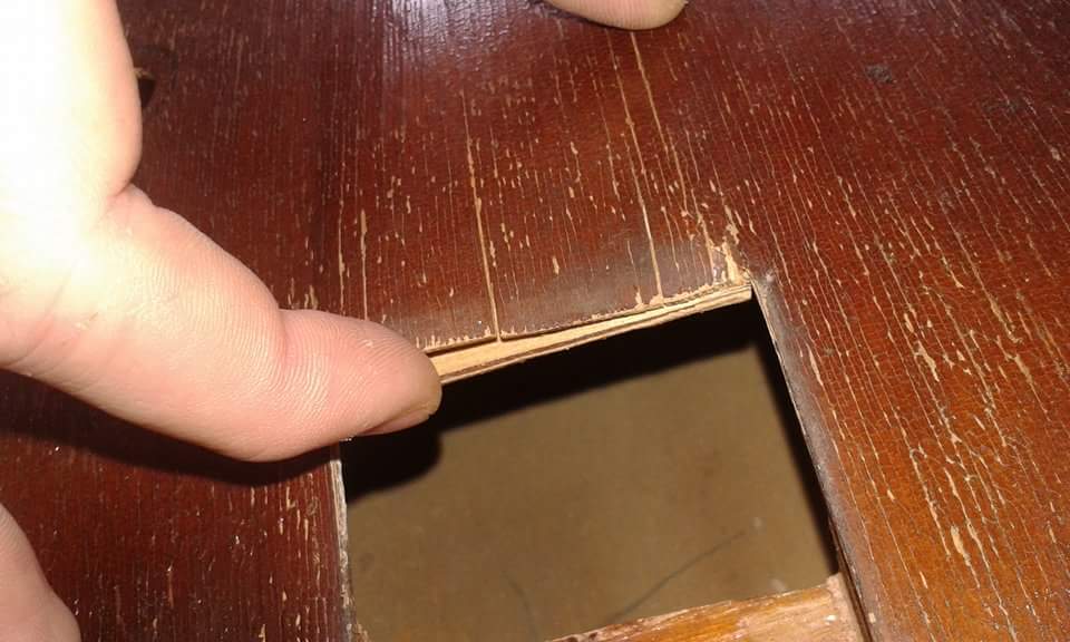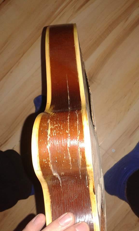 Rozwarstwiona płyta wierzchnia, prawdopodobnie gitara wiele razy została zawilgocona, a następnie przesuszona na wiór