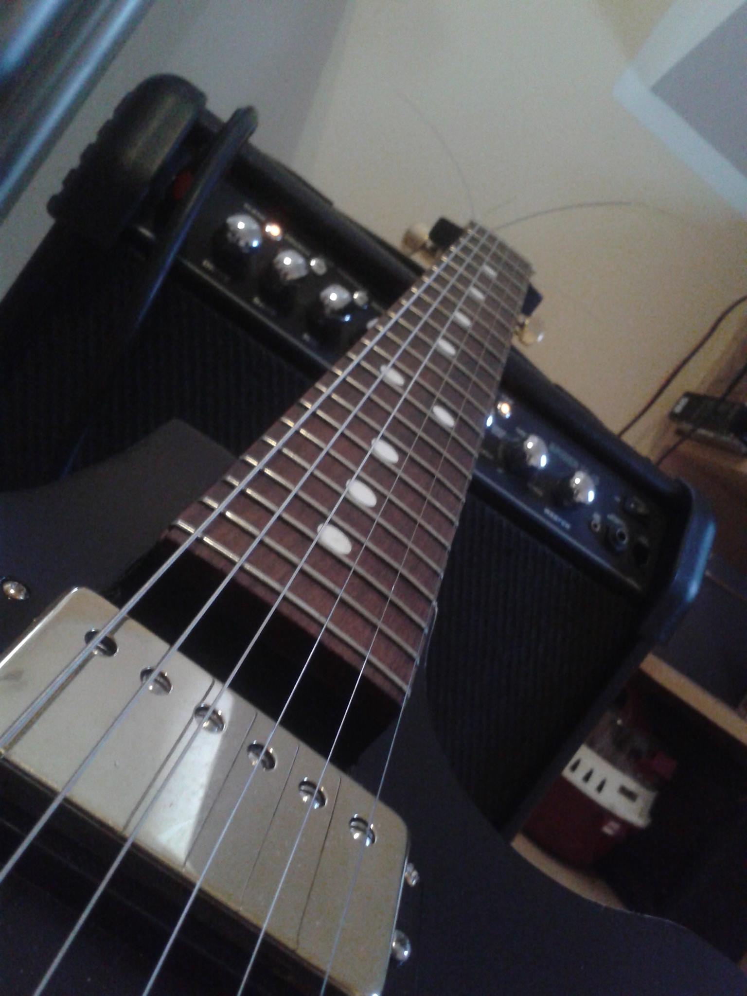 Gryf w stanie gorszym niż fatalny, odklejajęca się i pomalowana czymł podstrunnica, wyszczerbione progi i tak dalej. Był również sklejony z dwóch kawałków drewna (o tej samej długołci), które się rozkleiły. Gitarę wyposażyłem w gryf z Kosmosa