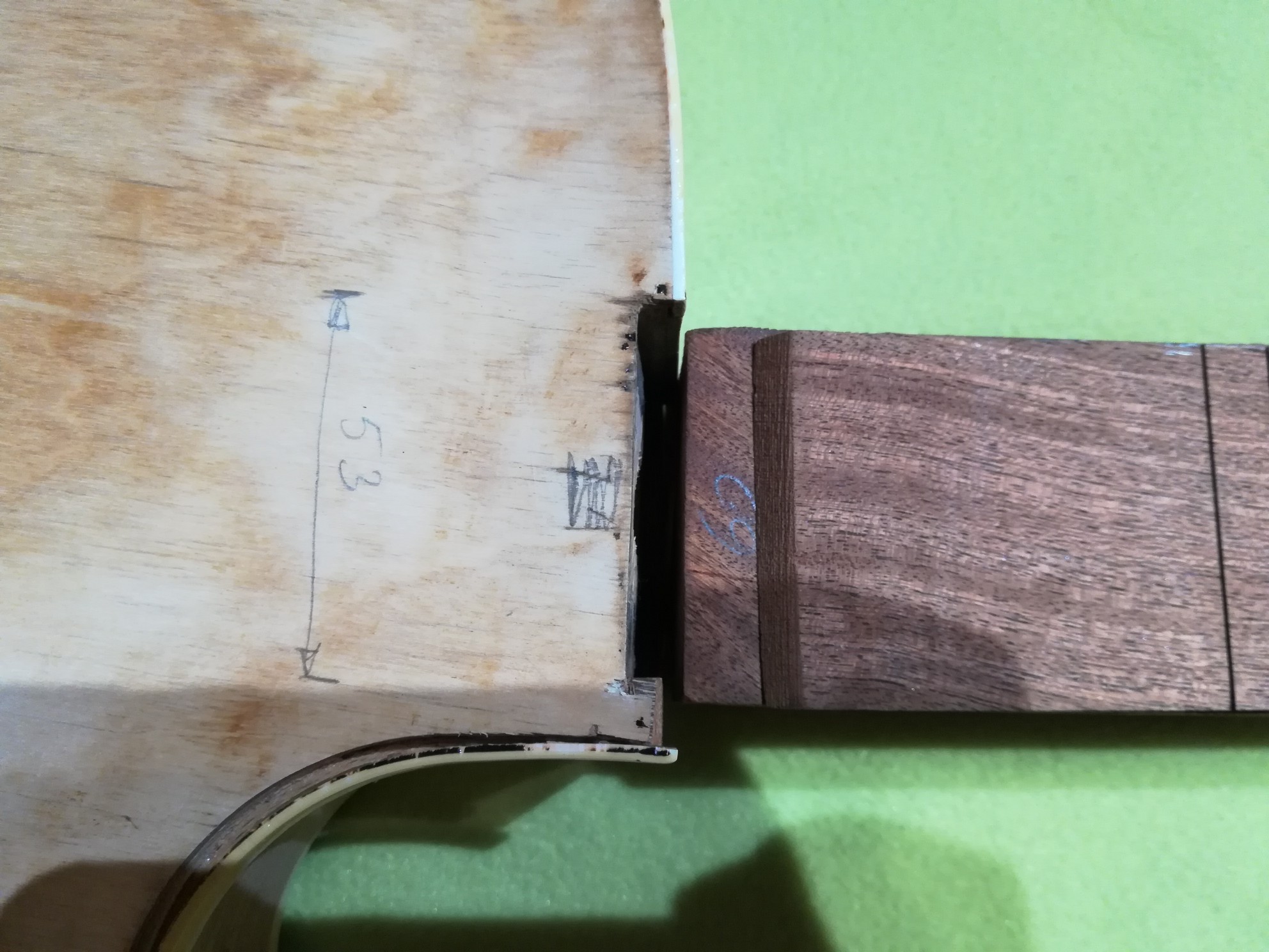 Połęczenie gryfu zrób na tzw. jaskółczy ogon zacięty pod kętem który ustalisz jako pierwszy- patrz pierwsze zdanie i popatrz w necie , jak to robię w gitarach klasycznych , czy archtopach, a potem dokładnie spasuj i wklej.
