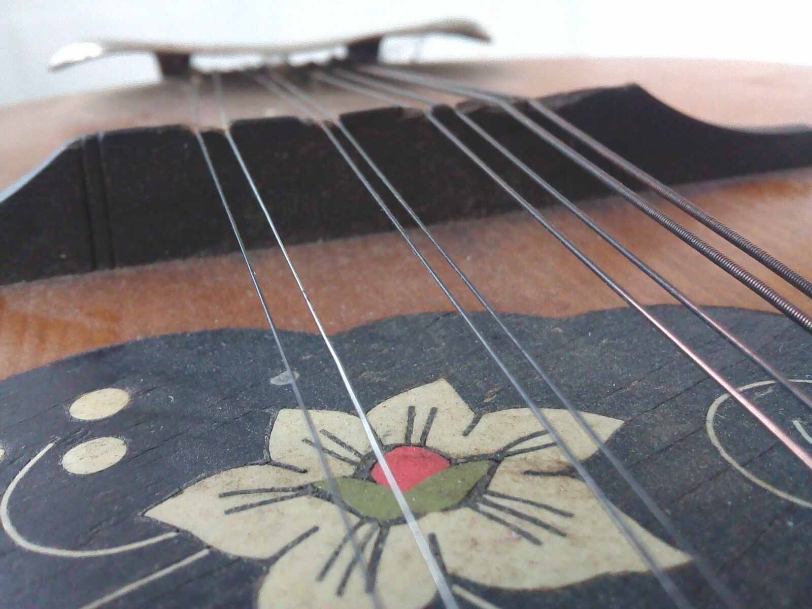 5/Mostek póki co jest taki tymczasowy z twardego drewna rezonansowego od wczełniej naprawianej cytry lełnej, w której obecnie jest kostny, wysokołę pasuje, rozstaw strun można by zmodyfikowaę.