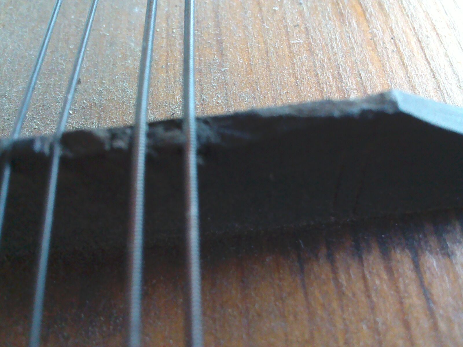 2/zapełniłem klejem przestrzeł która spowodowała pęknięcie fragmentu płyty wierzchniej pomiędzy klockiem a podstrunnicę,