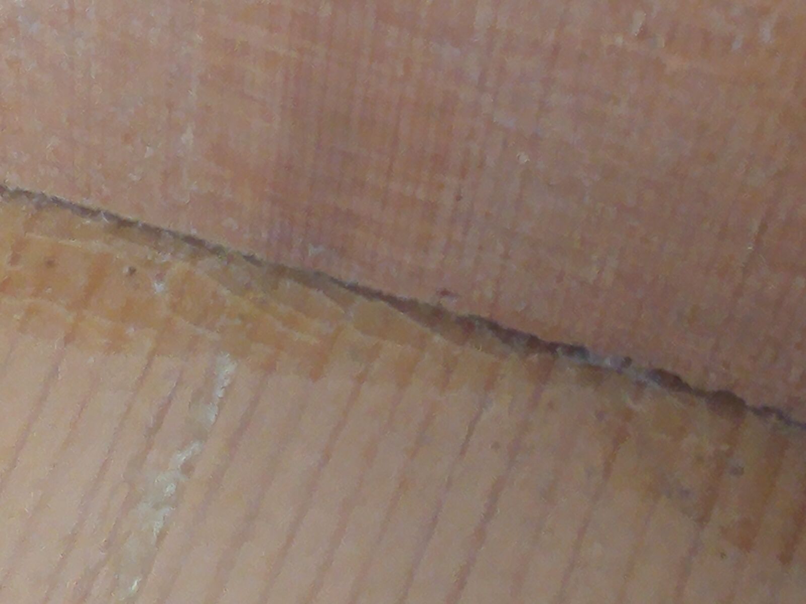 pod klockiem jest mała wolna przestrzeń, poniżej płyta wierzchnia, widoczne klejenie połówek płyty, a obok na lewo niewidoczne przy tej rozdzielczości równoległe pęknięcie