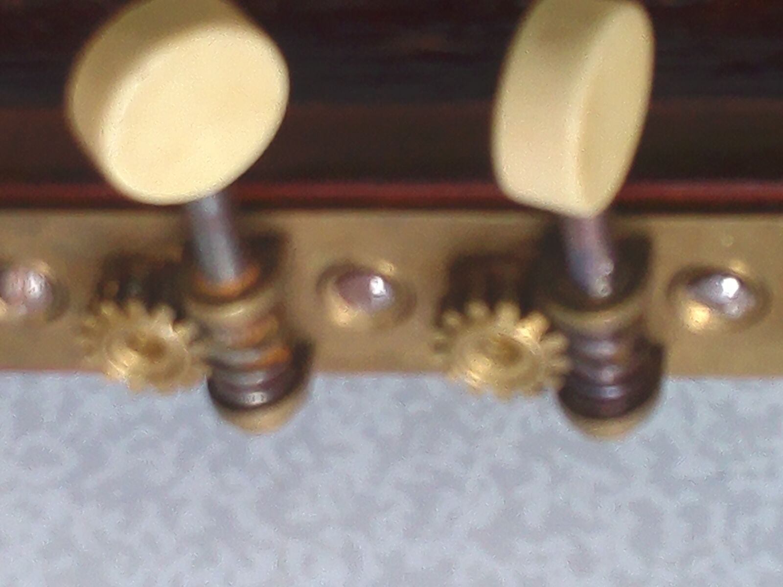 Popełniłem ostatnio zakup na niemieckim eBay instrumentu z lat 30stych minionego wieku za 30 Jurków, po prostu nie mogłem inaczej. Płyta wierzchnia w dobrym stanie, gryf prosty, odklejona płyta spodnia , progi na gryfie do wymiany, bo przesuwajęc po strunach paznokciami prawie że wbijaję się w nie, takie są zaostrzone.Mechanizmy do nakręcania strun stawiaję solidny opór pomimo pryłnięcia smarem.Mostek pod grubymi strunami spróchniały i zapada się pod ich naciskiem. Poniżej załęczam zdjęcia.