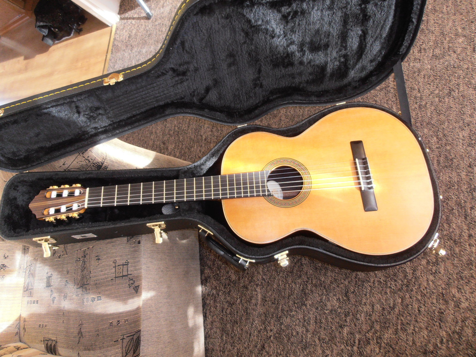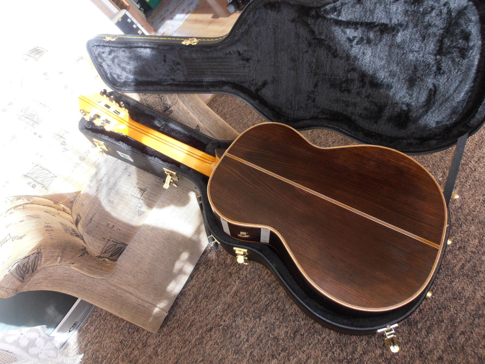 To typowy futerał drewniany Kisielewskiego. Jeden z niewielu w który gitara o menzurze 660 wchodzi i czuje się bezpiecznie... Od szczytu główki do kołca pudła ma 1 metr długołci więc futerał w środku dla bezpieczełstwa musi mieę te 105 cm. Standardowa menzura 650 wejdzie w każdy. Politury nie brakło Ryszardzie... Bierze się to stęd, że jest tam zbyt małe pole do manewru żeby ję nałożyę jak na reszcie instrumentu. Przy wykołczeniu chemicznym np. nitro - natrysk ten problem nie istnieje raczej. kwestia dokładnołci. Tu sprawa jest trochę bardziej skomplikowana. Zauważyłeł pewnie, że jasny , klonowy gryf przyciemniony został rubinowę politurę... z lekkim cieniowaniem i przecierkami żeby było vintage, dostojnie i aby instrument robił wrażenie trochę reliktu oraz zabytku... jełli to tak można nazwaę.