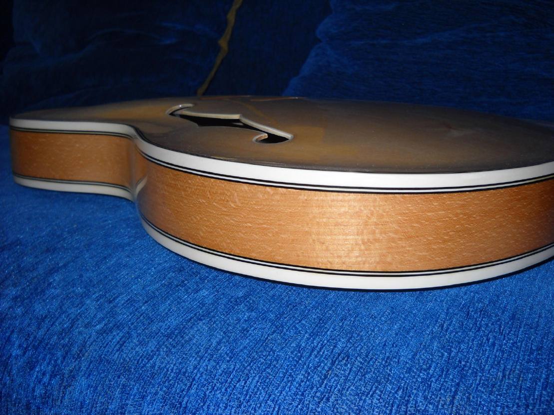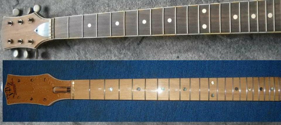 Wrzucam kilka fotek gryfu defilowskiego którego nieco przerobiłem tzn wywaliłem podstrunnice która była z buczyny i z palisandru i zroniłem nowę z orzecha.Z główki zdarłem fornir mahoniowy i dałem fornir z klonu -pawie oko.Oczywiscie jeszcze nie zaszlifowane progi są dopiero po nabiciu i bocznym wyrównaniu.No i podstawek pod mostek Tune-O-Matic zrobiłem z akacji