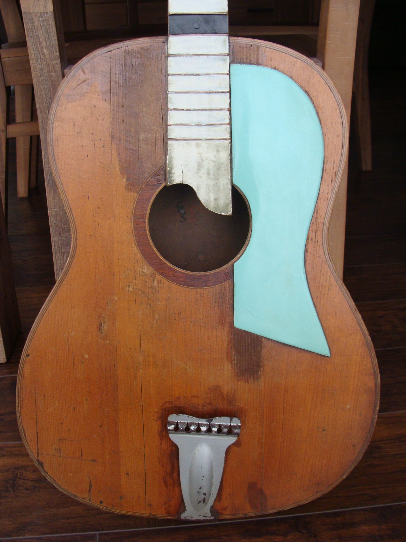 To okropne plastikowe to element wtórny zamontowany przez dziadka "bo coś mu się tam działo na powierzchni". Jest oczywiłcie do usunięcia. Dopiero wtedy się dowiem jak to wyględa pod spodem. Tak jak i szatałskie kolory na gryfie niczym klawisze fortepianu. Moim skromnym zdaniem gitara jest raczej w dobrym stanie. W środku nic "nie lata"