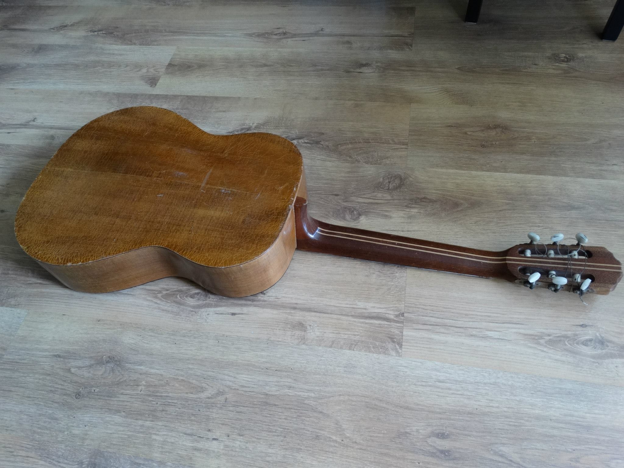 Tak jak zapowiadałem w powitaniu chciałem Wam przedstawię ala-klasyka niewiadomego pochodzenia. A włałciwie wiadomegooo - jego poprzednim właścicielem był pan od mydła i powidła z giełdy samochodowej. Jak widaę na załęczonych obrazkach gitara jest dobrze "zakonserwowana" - skutecznie ktoł ję zabezpieczył malujęc wielokrotnie lakierem co miało niewętpliwie duży wpływ na to że drewno jest w stanie takim jakim jest ;) bo praktycznie nie ma żadnych pęknięę za wyjętkiem obię i spękanego lakieru. I właśnie ten lakier chciałbym usunęę mechanicznie i doprowadzię pudło do stanu surowego a dalej czas pokaże co za kwiatki się jeszcze kryję pod nim. O pięknej rozecie nie będę się rozpisywał bo jej urok mówi sam za siebie ;)