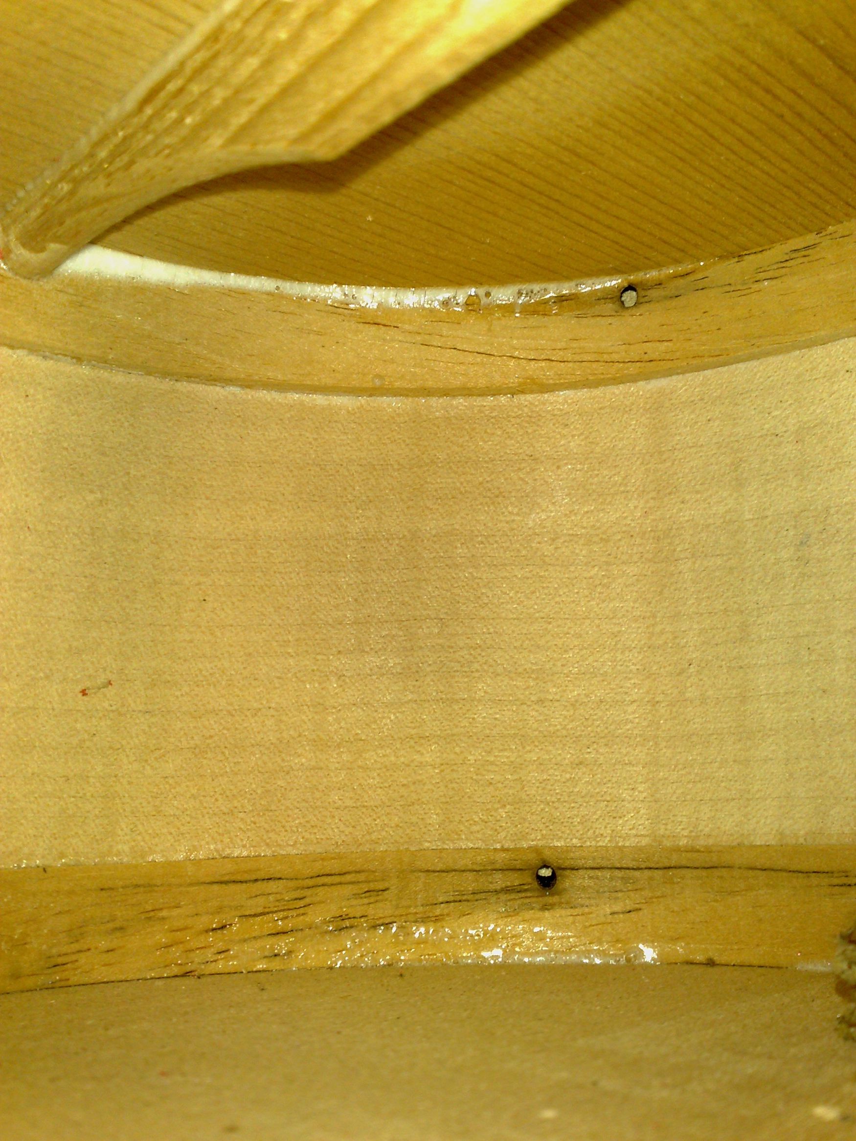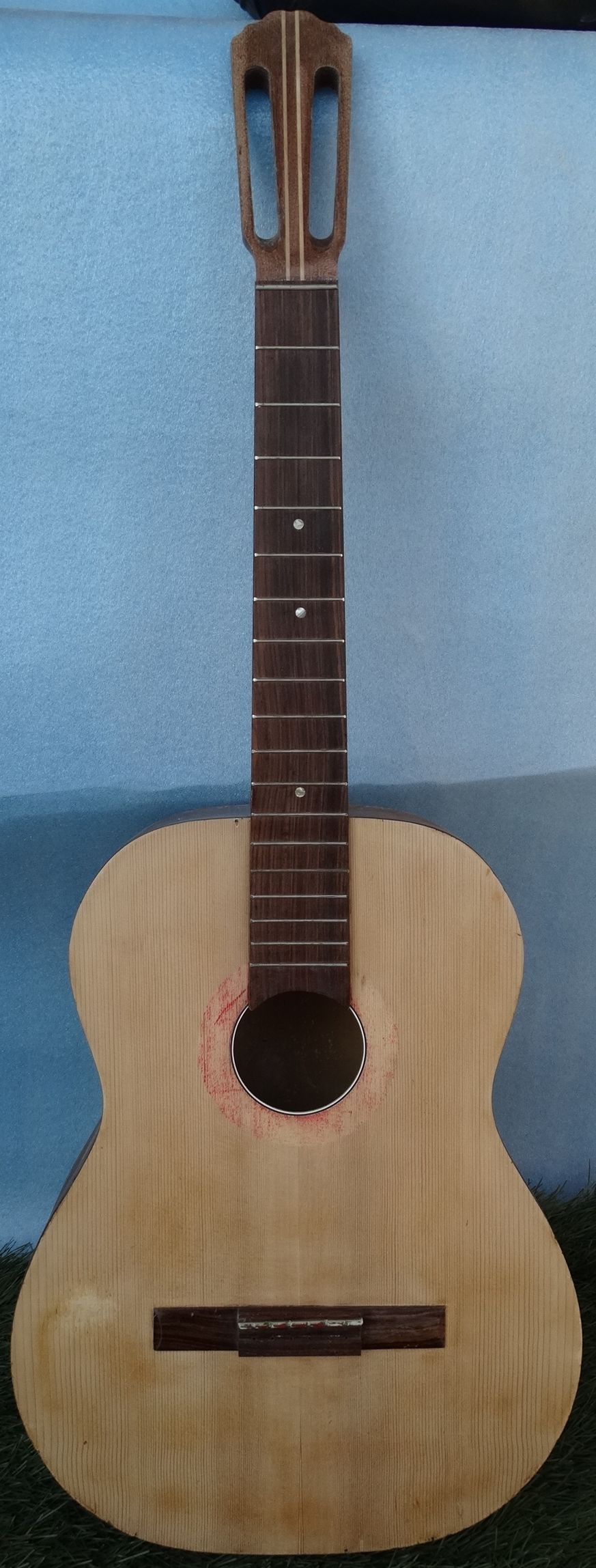 no proszę:) Piękna gitara, warto ję poprawię. Ja osobiłcie pierwsze co bym zrobił to odkleił to coś co zasłania w otworze rezonansowym przekrój przez płytę wierzchnię, żeby upewnię się czy to lite drewno czy sklejka. Boczki i tył są bardzo ładne, mostek również. Generalnie masz poligon do dołwiadczeł lutniczych po byku;) Co do wykołczenia, pod politurę wyględała będzie miód malina:) Ja właśnie gotuję lakier spirytusowy:)