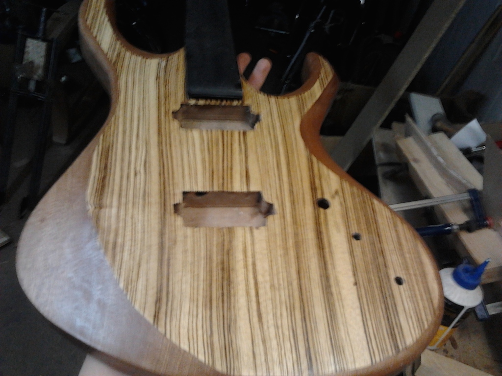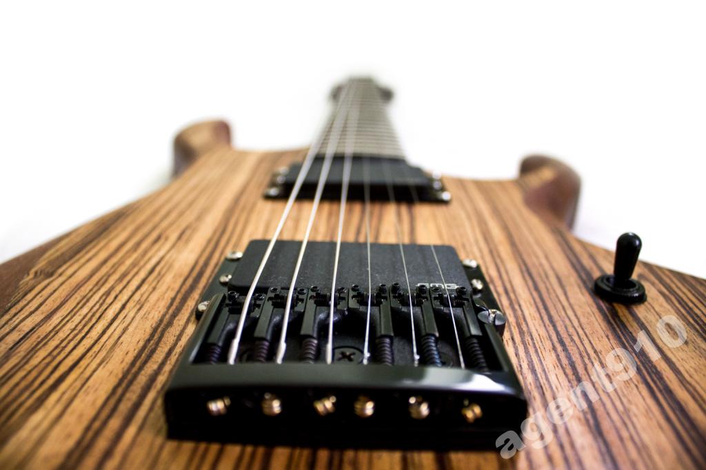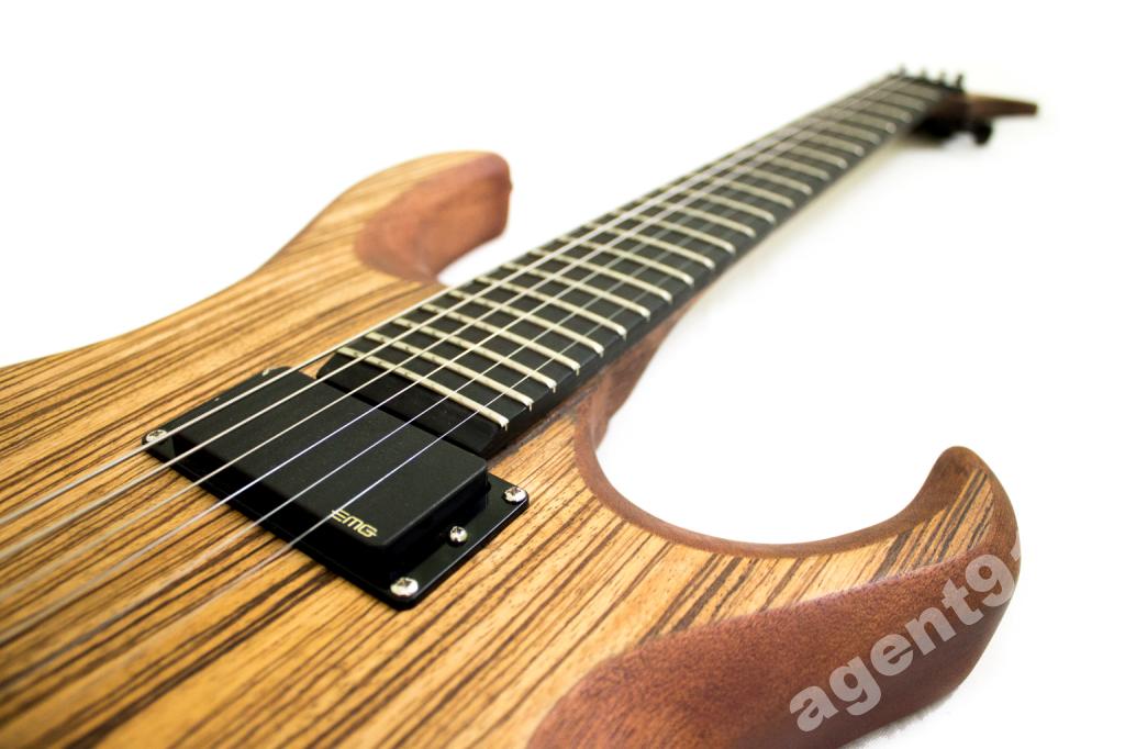 Na top został naklejony fornir Zebrano. Fornir, dla tego, że ograniczał mnie budżet. Podstrunnica z drewna hebanowego z radiusem 12 cali. Teraz czas na osprzęt. Przetworniki to EMG 81 oraz 85, mostek Schaller 3D, klucze Planet waves, blokowane. Siodełko Graph Tech. Gryf został wklejony w korpus. Jestem bardzo mile zaskoczony długim sustainem gitary.