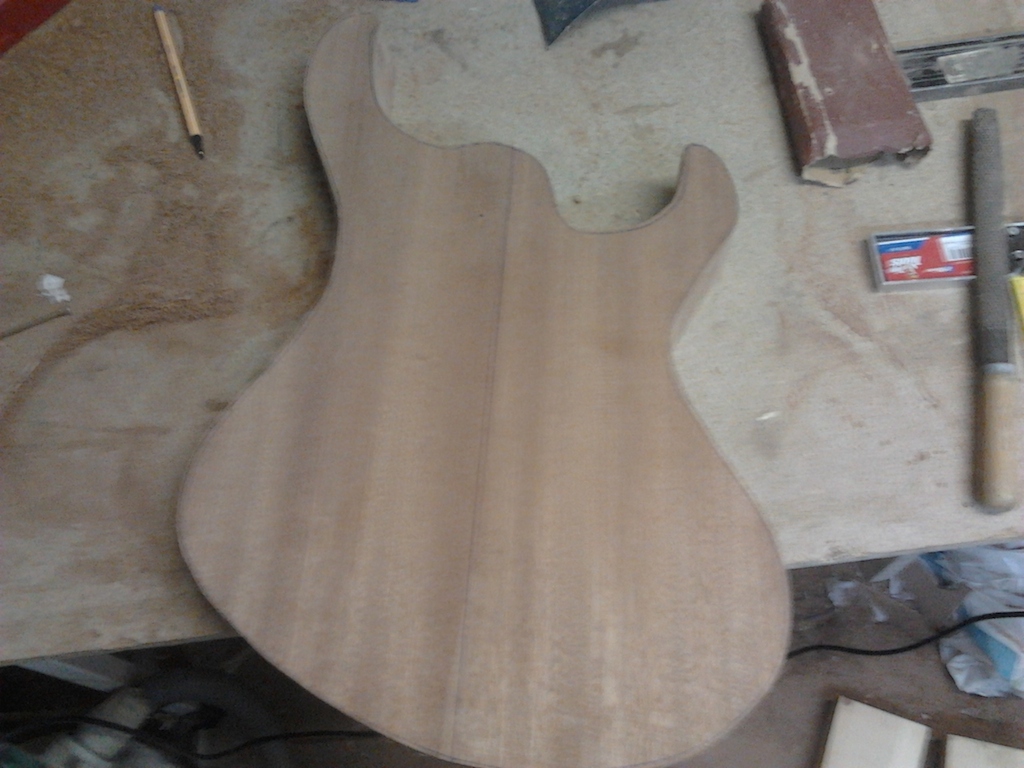 Tutaj już gotowy korpus z wklejonym gryfem. Położony lakier nitro. Niestety nie miałem wtedy kompresora i chciałem położyć lakier nitro tamponem. Pierwsze 3 warstwy były niczego sobie, niestety później pojawiły się wżery. Zrezygnowałem z lakieru i położyłem olej.