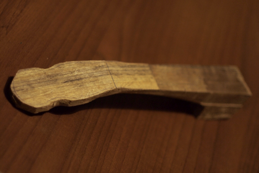 Przygotowałem gryf pod dalsze obrabianie. Również tym razem zdecydowałem się nie sklejaę gryfu przy główce, a wycięę ję przez odcięcie klina i szyjka aż po czubek głowy jest lita. Kęt jest ciut mniejszy niż mógłby byę, ale ostatnim razem sprawdził się, struny dobrze leżę w siodełku, nie ma problemu.