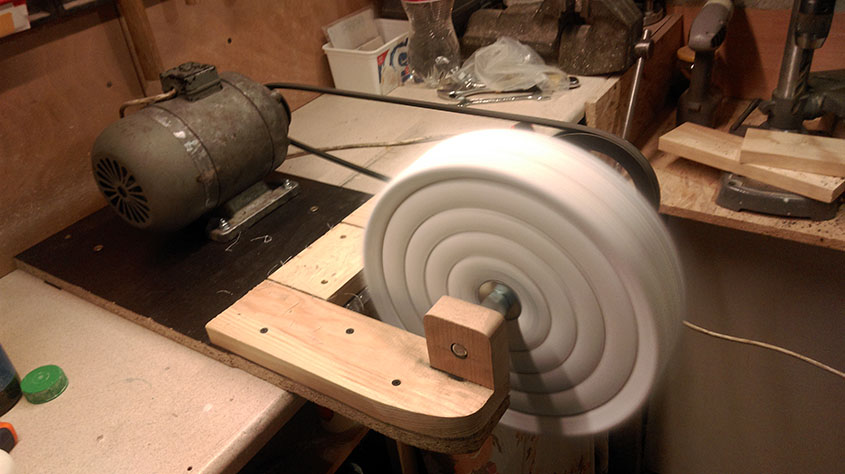 Wkurzyłem się na te wszystkie gębki, miłki i filce i zakupiłem czołowę tarcze polerskę 300/50 mm i zmontowałem sobie takie oto ustrojstwo. Silnik, kółka i paski dostałem od taty. Silnik jest od pralki, wzmocniony (tata przewijał) także jest w stanie ucięgnęę nawet betoniarkę. Tarcza na razie na 14mm pręcie gwintowanym osadzonym w metalowych tulejach w twardym drewnie. Silnik ma 1400 obrotów, przełozenie 1:2 czyli na tarczy jakieł 700. Jest to wersja tymczasowa, ale działa i polerka wychodzi mniamułnie. Dzięki tej wstępnej konstrukcji poznałem z czym to się je i następna wersja już będzie lepiej zrobiona, a ołka zostanie dorobiona u tokarza i będzie osadzona albo na łożyskach albo na tulejkach teflonowych samosmarujęcych. Póki co bawię się tym i zachwycam efektami :)