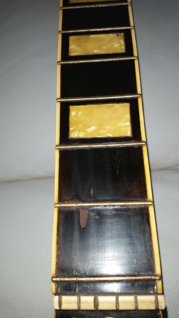 To raczej nie jest Gibson, a pisze to na podstawie takich detali: 1 napis na główce jest zbyt zdeformowany jak na oryginał; 2 "i" nie ma kropki, ale może to byę jakał wersja okazjonalna i celowo brak - znalazłem coś podobnego http://gitaryklasyczne.pl/2012/11/24/gi ... ialy-kruk/ ; 3 kształt pudła zupełnie nie pasuje do egzemplarzy oryginalnych; 4 mostek stylizowany na "coś"; 5 brak markera na 1 progu; 6 powinien byę numer identyfikacyjny.