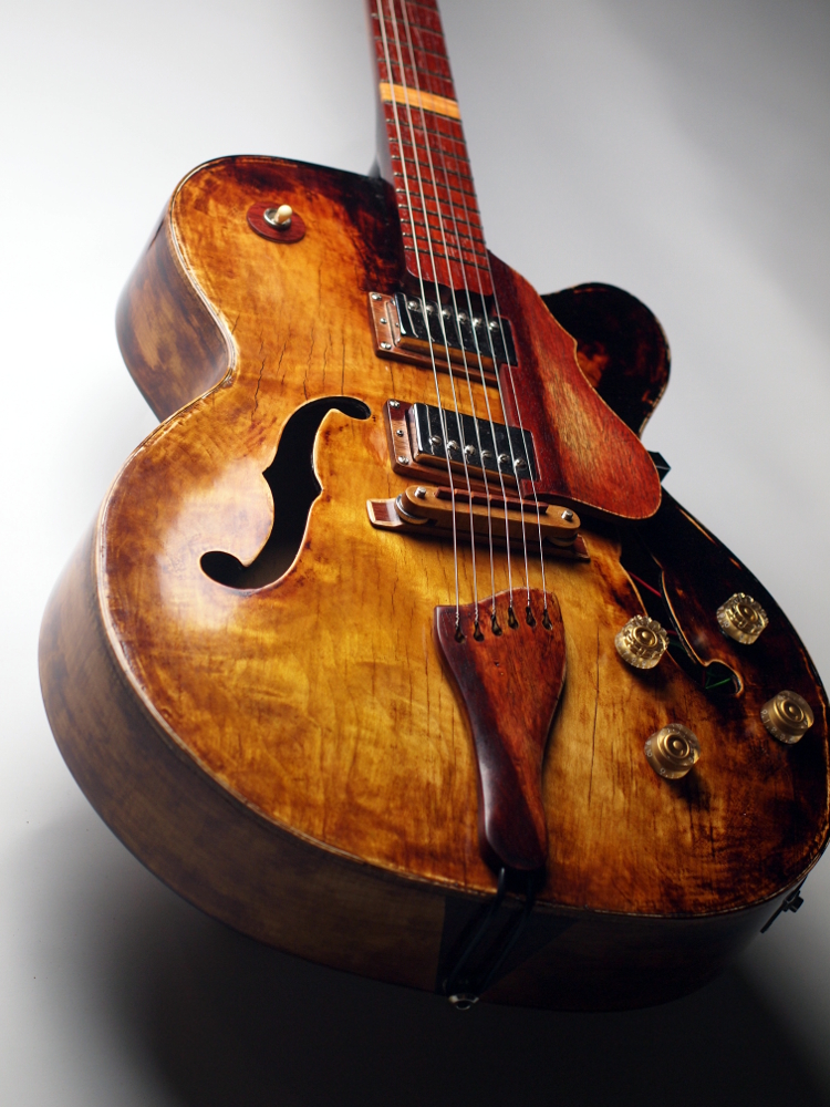 To był bardzo dobity i pokiereszowany niemiecki archtop kupiony za 300zł na a..gro. Zmian jest sporo, wywalone plastiki, których wszędzie było pełno. Zastępiono je drenem. Nowa podstrunnica, nowe okładziny na główce, nowa stopa gryfu i gniazdo (gryf osadzony był nie w osi). Nowy lakier (spirytusowy). Ta gitara na oko ma jakieł 50 lat, może więcej. Ma masą spękał, bruzd, dziurek, obię, przetarę.. ale mi to nie przeszkadza. Celem nie było zrobienie jej tak, by była jak nowa. Jest stara i ma zmarszczki. Mam ję od kilku ładnych lat i zawsze chciałem coś z nię zrobię, żeby zagrała, gra i stroi:)