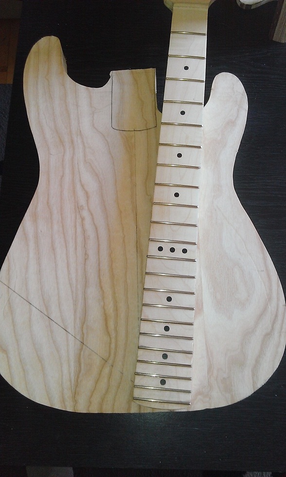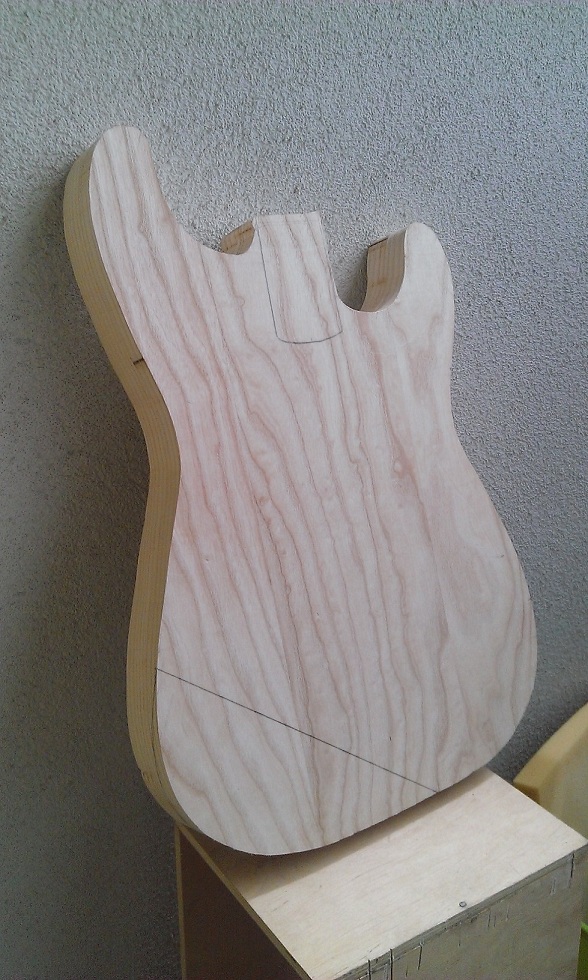 Zamówiłem na allegro bloczek do profilowania podstrunnicy a w między czasie wycięłem pickguard, korpus i zaczęłem go frezowaę ale widzę, że popełniłem błęd. Wczełniej na desce trzeba było chyba narysowaę linię od góry i od dołu tak, żebym mógł szablon założyę od drugiej strony i dokołczyę frezowanie