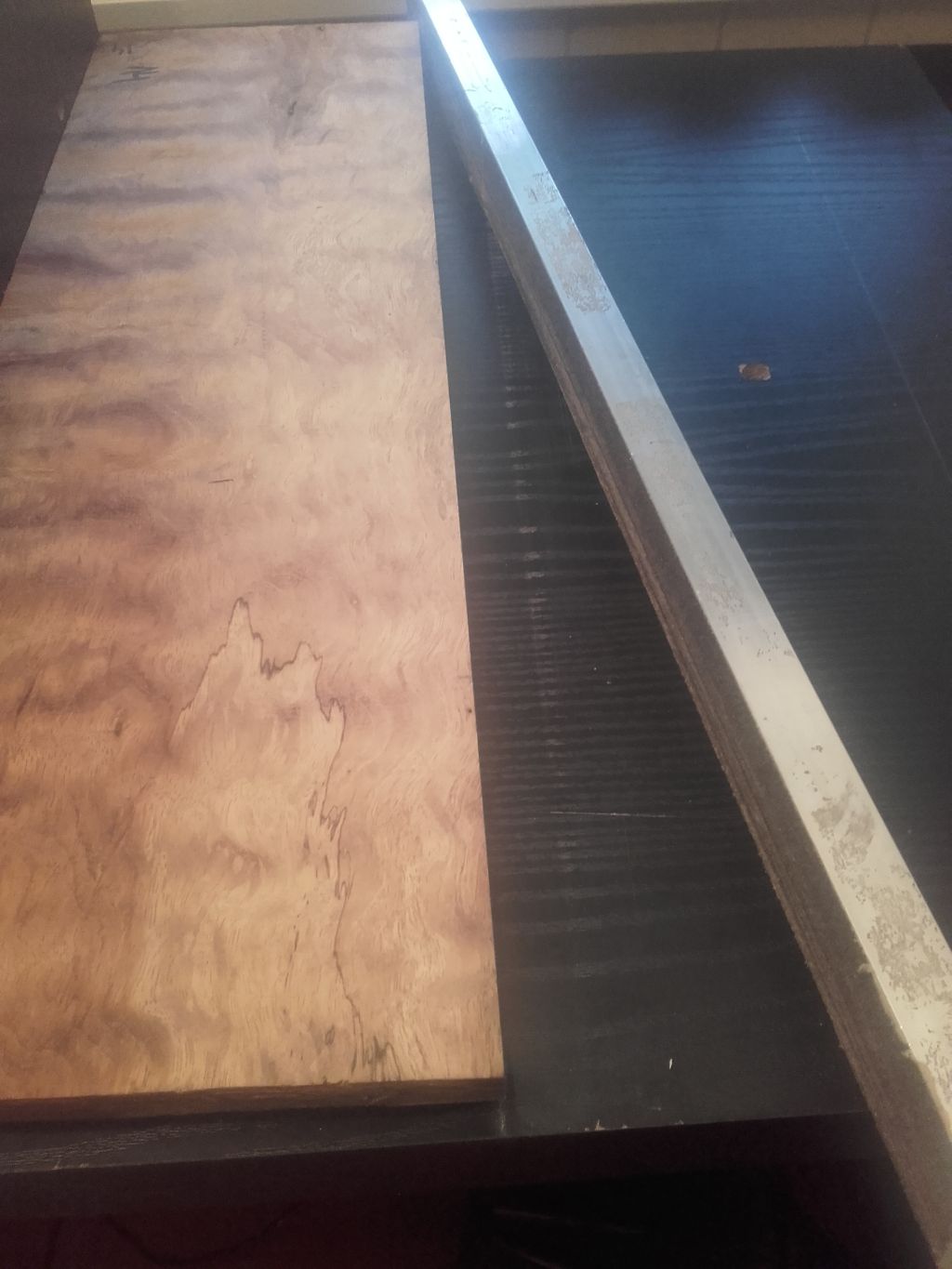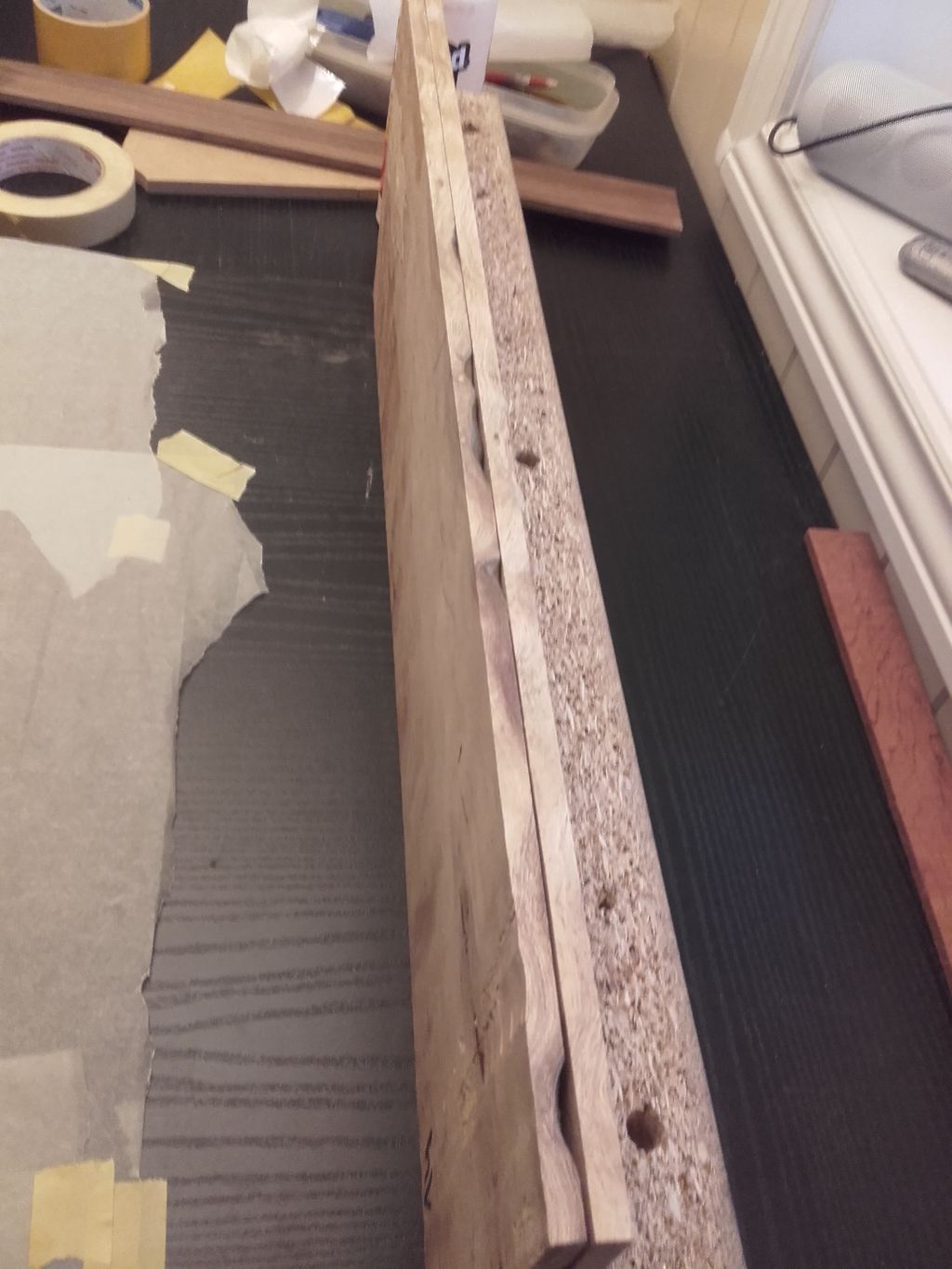 Równanie krawędzi.Dwie częłci topu złożone częłcię wewnętrznę do siebie, papier łcierny przyklejony do profilu aluminiowego. Po równaniu przed klejeniem Na jednej częłci topu widaę braki, które po sklejeniu zamierzam wypełnic epoxy lub klejem zmieszanym z trocinami. Top oparty na podkładkach i listwa dociskęca.