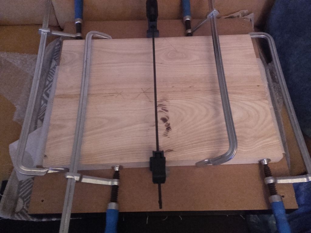 Korpus został sklejony splanowany. Zanim przyjedzie nowy szablon może jakieł odkształcenia z niego wyjdę. Korpus czeka i nabiera mocy. Kontynuuję prace nad podstrunnicę. Od szablonu z drżęcymi łydkami ze strachu, że coś pójdzie nie tak wycięłem kształt podstrunnicy. udało się