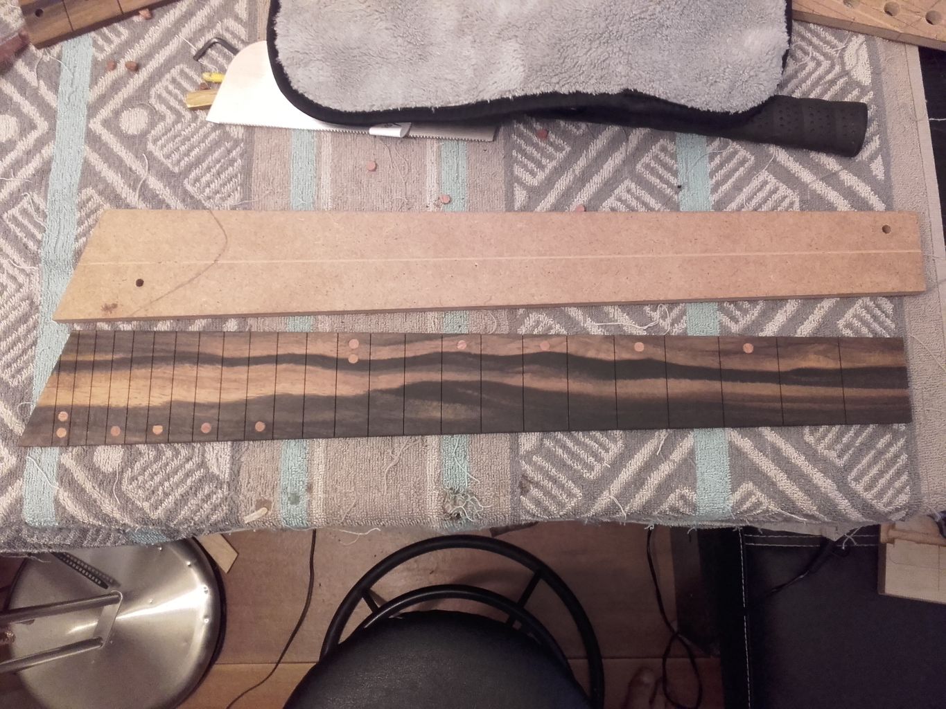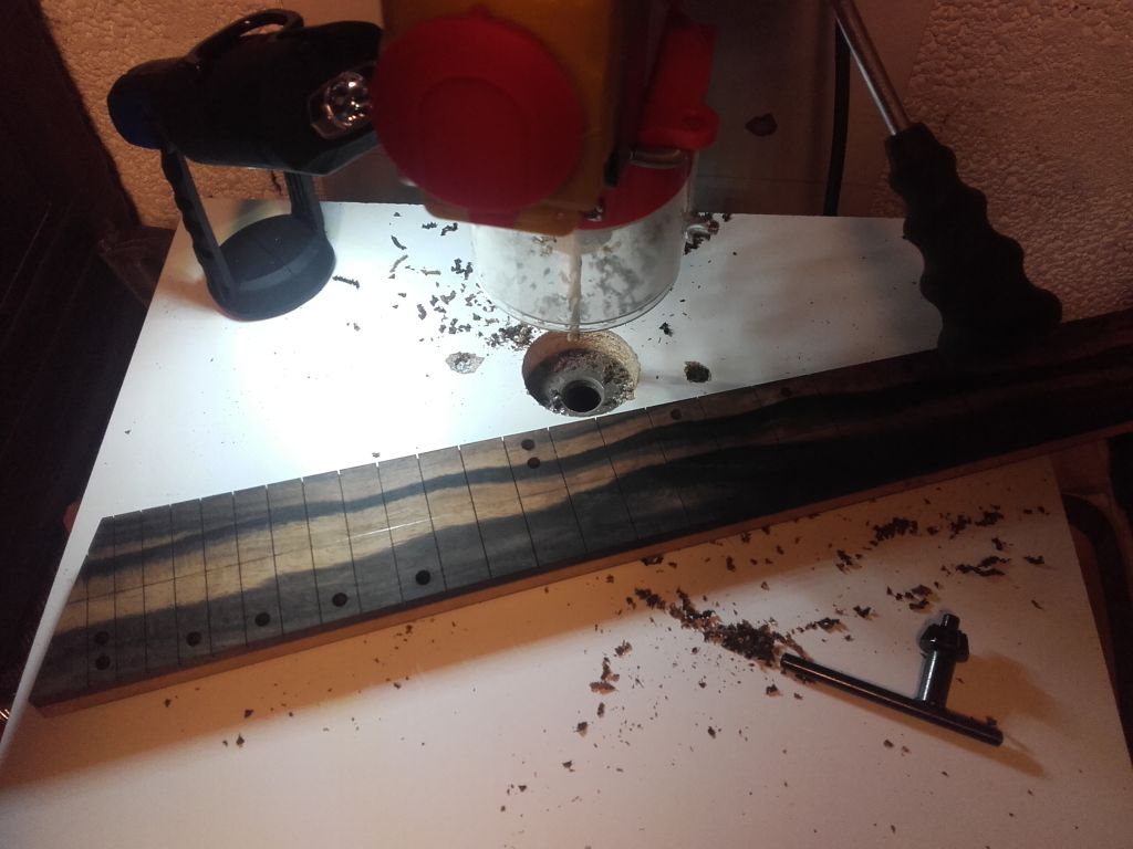Pacjent na stole. Otwór wypełniony klejem Jeszcze osiem do lekkiego szlifu i wklejenia Po zabiegu. Zeszlifowane lekko, jeszcze na płasko. Zastanawiam się czy radius nadawaę przed przyklejeniem do gryfu czy przed.