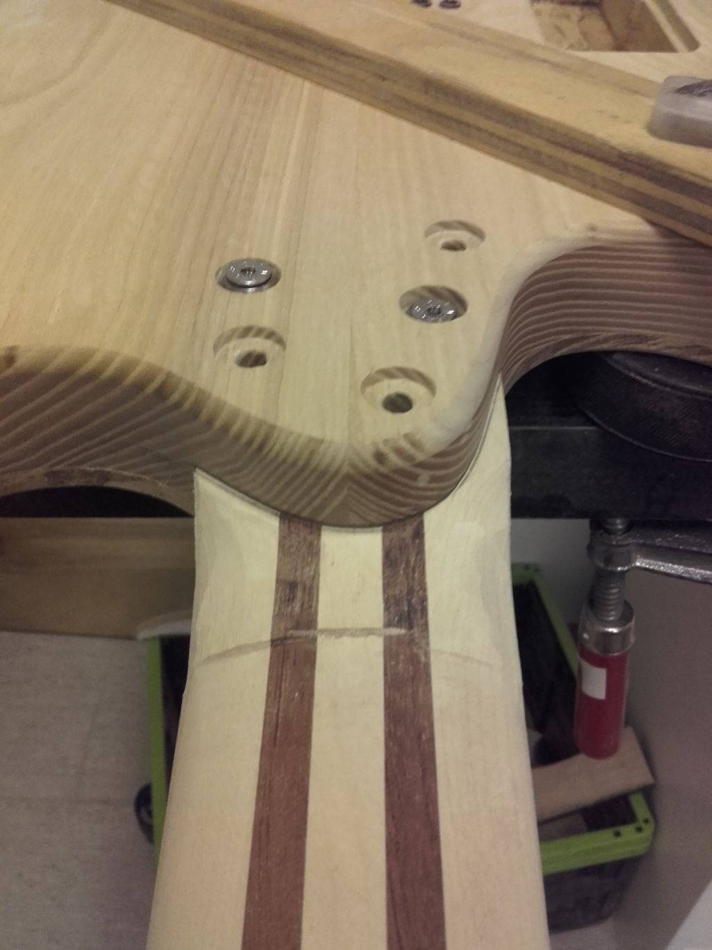 Profilowanie gryfu przy przejłciu w korpus robiłem na przykręconym gryfie do korpusu. Według mnie mniejsze ryzyko zeszlifowania za dużo i lepsze spasowanie z korpusem.