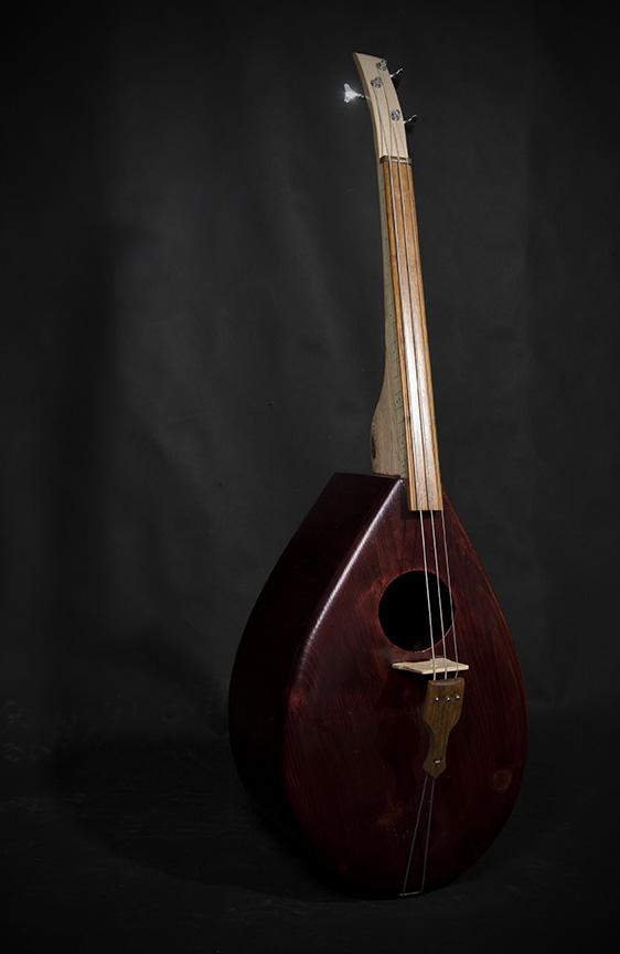 Ostatecznie z pewnych powodów logistycznych zdecydowałem się na zastosowanie strun od gitary basowej... pierwszej, trzeciej i czwartej... strojęc je do ADG. Płyta przednia i tylna pudła została wykonana z drewna (nie potrafię rozpoznaę gatunku), które najpierw przez parędziesięt lat było chyba komodę, potem przez kilka kolejnych było półkę w piwnicy. Boki są sklejkę. Gryf jest jesionowy... a podstrunnica.... tak.... z prasowanego bambusa