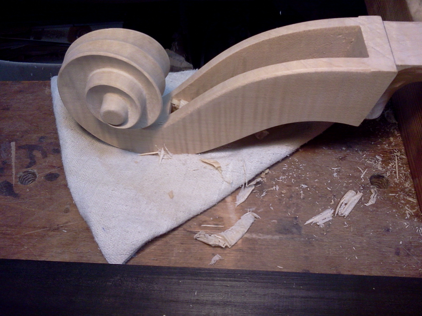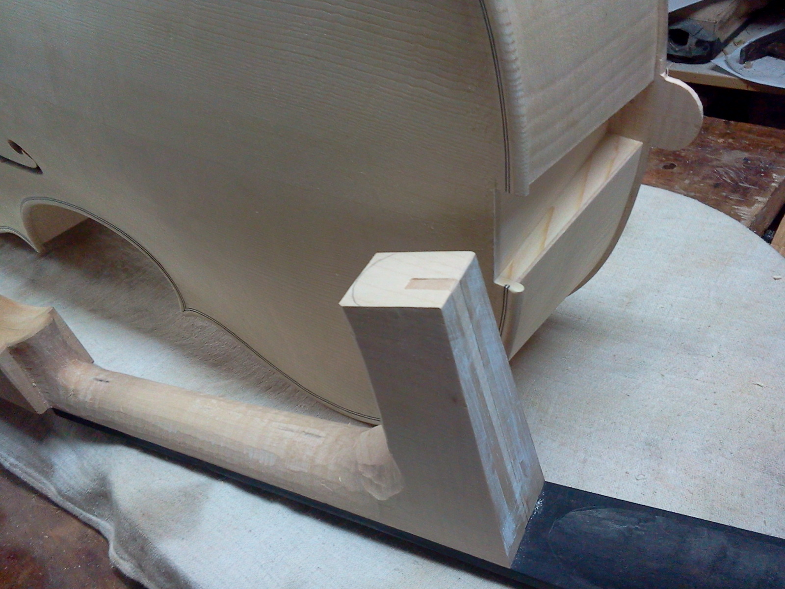 To taki nasz sposub na zabezpieczenie przed wyłamaniem szyjki w razie przewrócenia. Robimy też tak by więcej materiału szyjki wchodziło w pudło. W skrzypcach tego nie trzeba bo to stosunkowo mocne miejsce i prędzej szyjka wypadnie z piętkę. Tak że trzeba o tym pamiętaę przy pasowaniu żyłki w jaworowej płycie by nie wcięę sie tam zbyt głęboko.