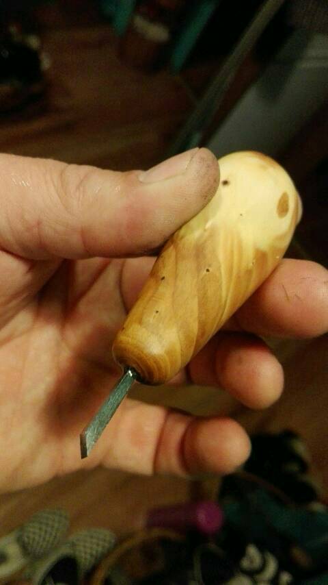 Dłuto i nóż skołczone, odpułciłem w 200 *C w piekarniku i osadzilem na żywicy epoksydowej. Jedno dłuto niestety pękło i czeka na przeróbkę. Nóż jest niesamowicie ostry dłutko też