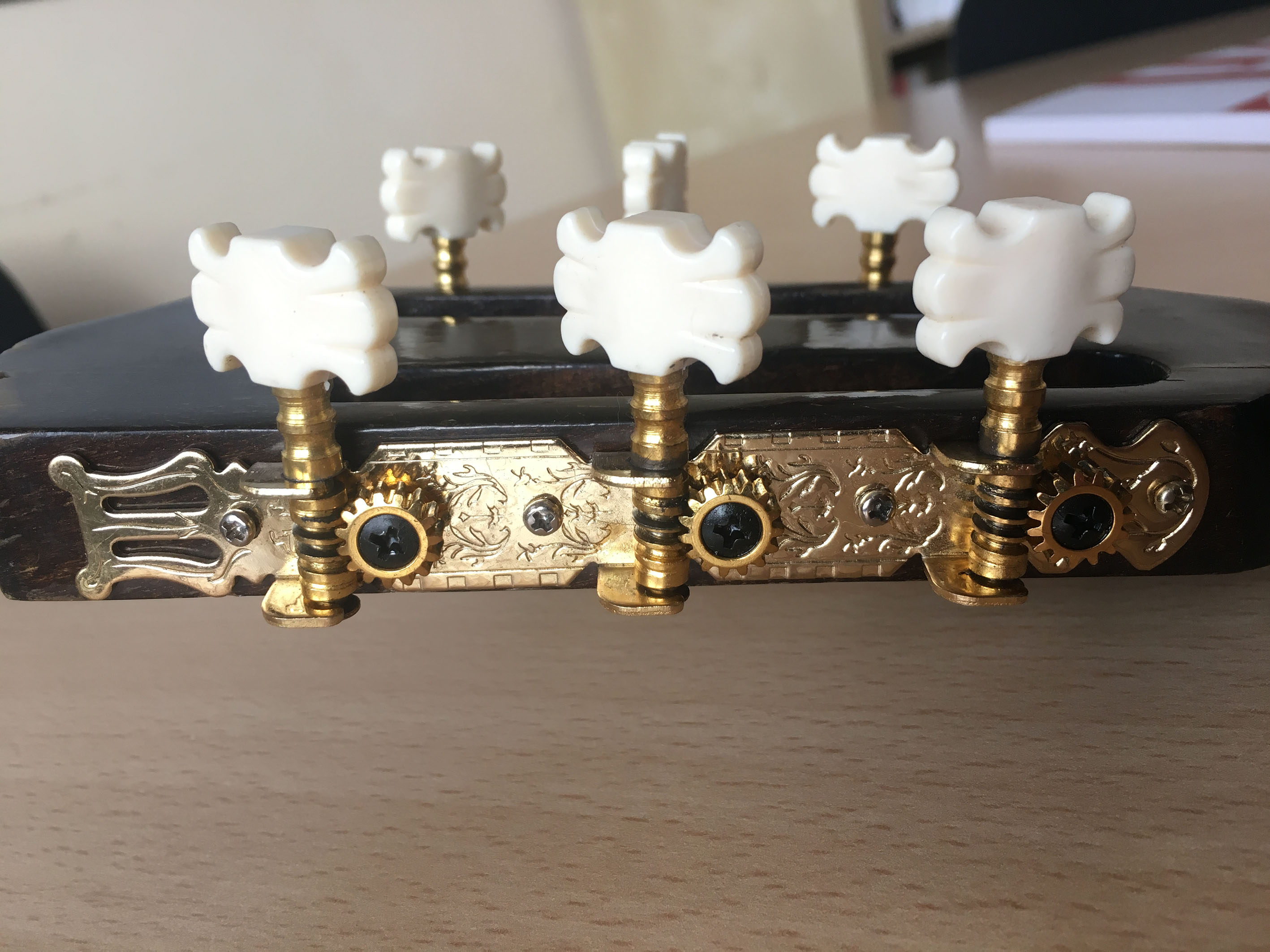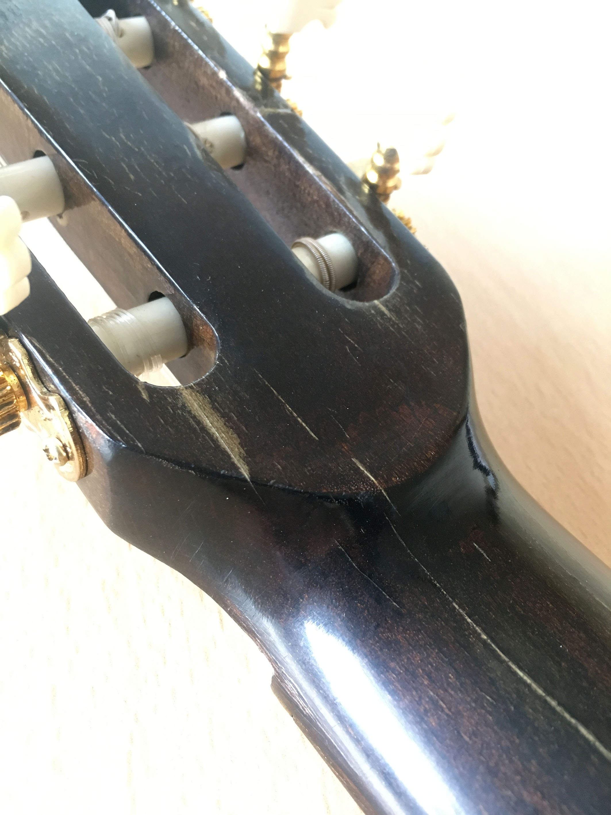 Witam wszystkich. Mam kolejnego weterana - i tu pojawia się epickie pytanie: ociec, graę?!... Jak widaę na załęczonych zdjęciach - gitara jest w niezłym stanie ogólnym, dobrze stroi, bardzo ciekawie, ciepło wybrzmiewa. Jednak, niepokojęce są te spękania lakieru na gryfie, główce, na topie. Dodatkowo, top w skrajnych punktach mocowania mostka wyględa jakby był leciutko pęknięty. ByęĂ może to tylko spękanie lakieru.