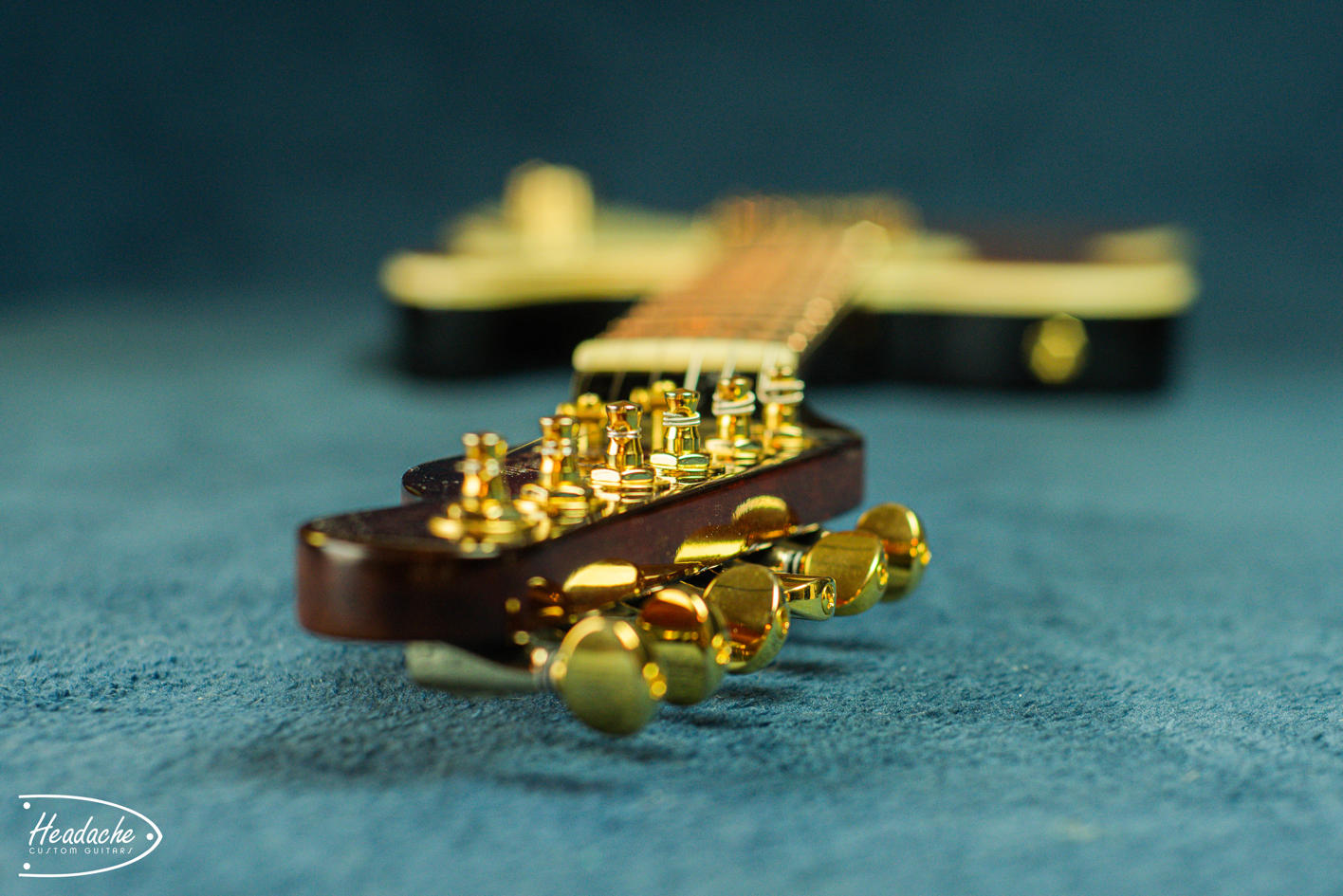 Na pokładzie złoty osprzęt Koynes Gold oraz niekonwencjonalne, prototypowe rozłączane pickupy od Hathor Pickups . Konstrukcja typu sidewinder, stalowy rail, dwie cewki po bokach. Wysoka rezystancja to efekt użycia ultra cienkiego drutu, bo ilość miejsca tam jest bardzo ograniczona. Magnesy neodymowe.