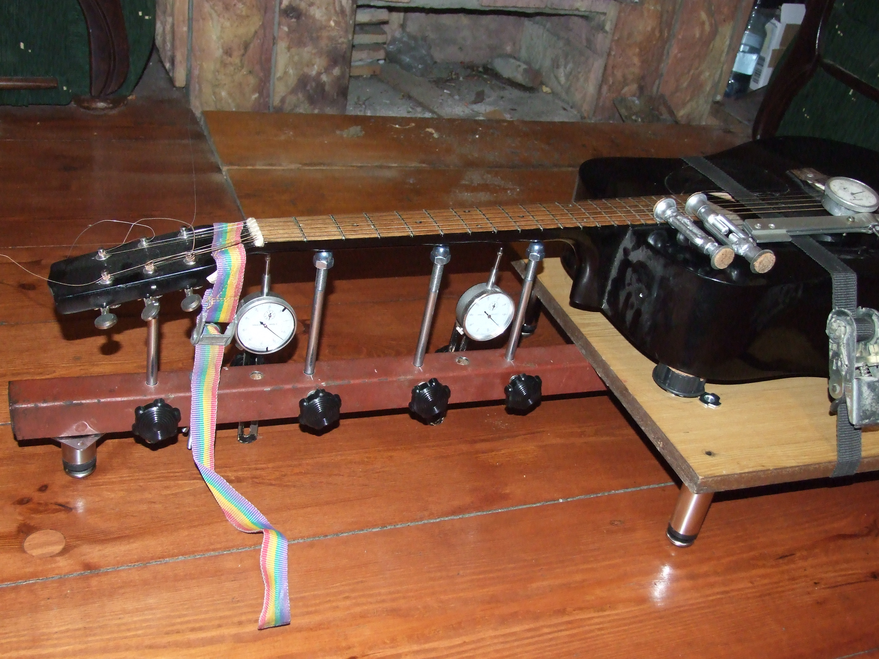 Ustawiamy w płaszczyęšłnie podpory pod deskę tak aby po położeniu gitara miała gryf w zakresie regulacji czujników. Mocujemy bardzo solidnie gitarę pasami. I tu miałem problem bo miałem tylko jeden ze łcięgaczem, drugi był gładki więc poradziłem sobie więżęc i skręcajęc. Trzeba będzie kupię drugi koniecznie.