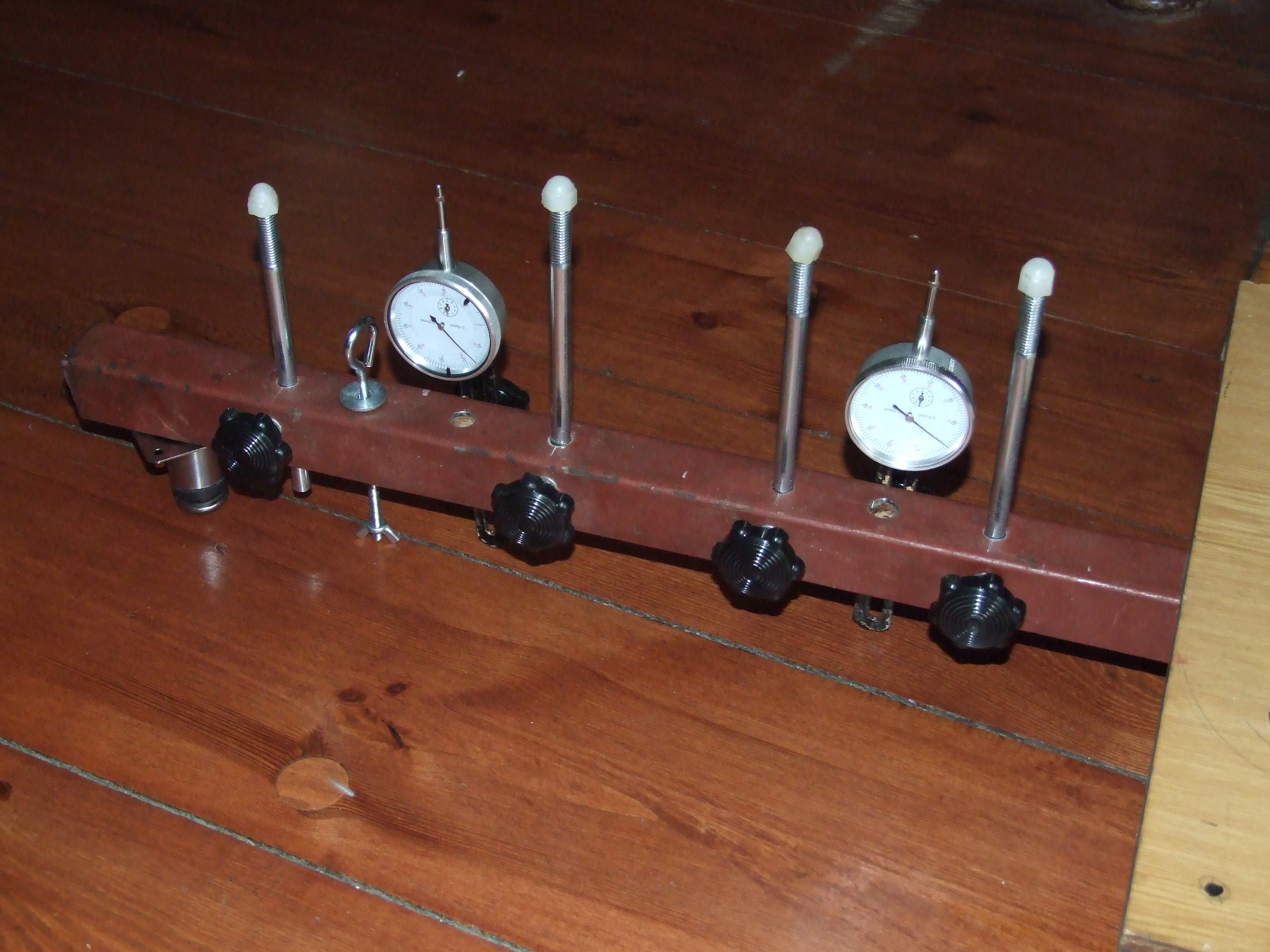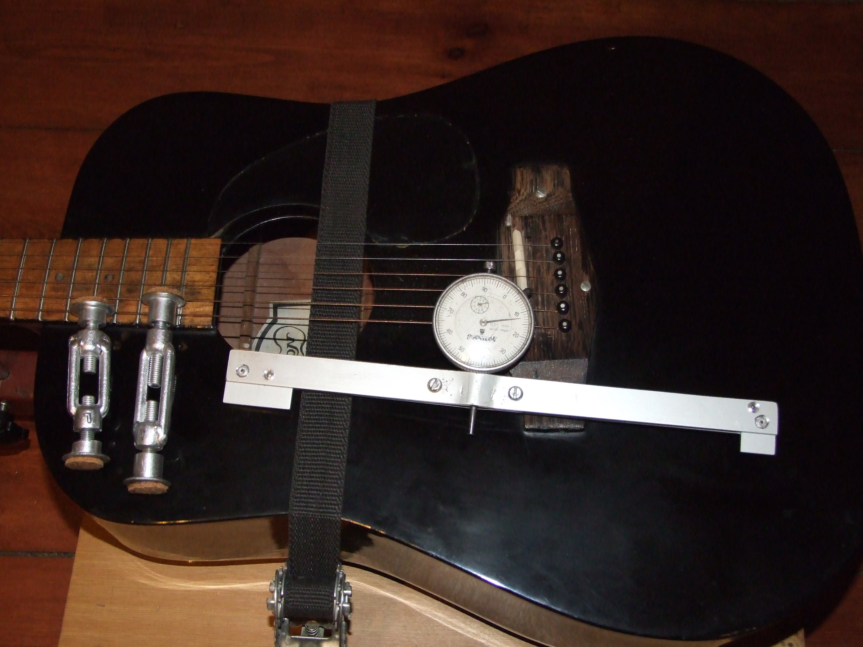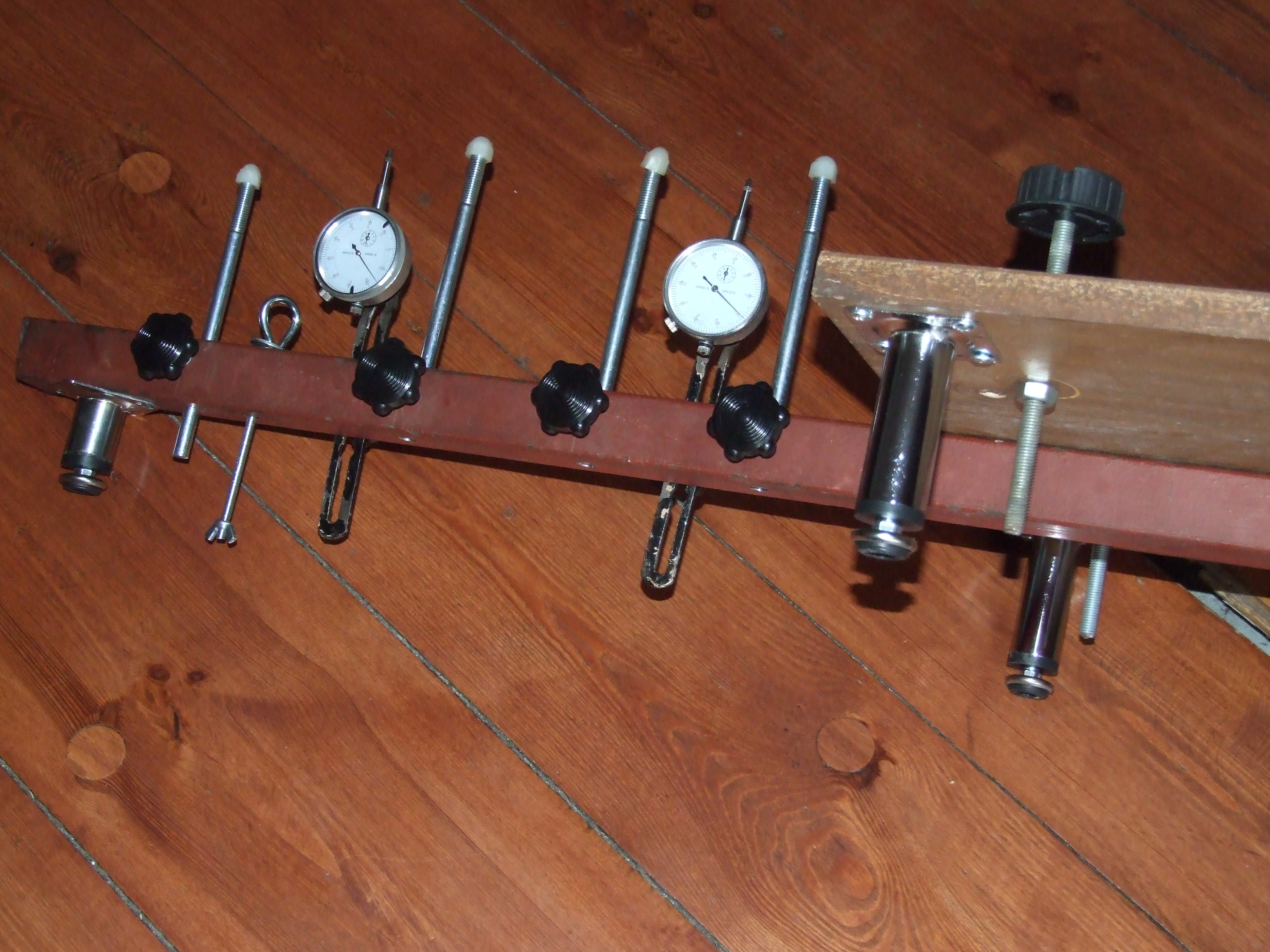 A, jeszcze wykonałem sobie taki sprzęt pomiarowy do ustawiania krzywizny gryfu, czyli dwa płaskowniki aluminiowe znitowane i wpasowany pomiędzy nie czujnik, blokowany dwoma wkrętami. Taki rodzaj "gryf miarki" :lol: