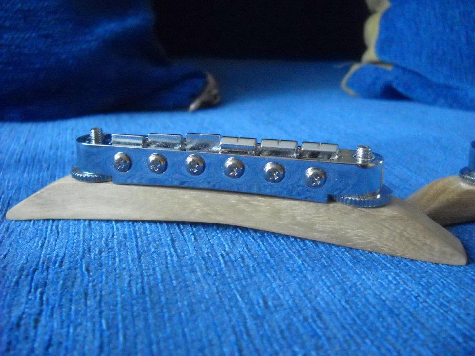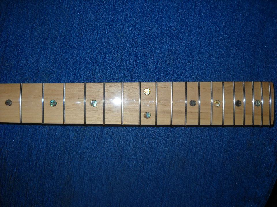 Wrzucam kilka fotek gryfu defilowskiego którego nieco przerobiłem tzn wywaliłem podstrunnice która była z buczyny i z palisandru i zroniłem nowę z orzecha.Z główki zdarłem fornir mahoniowy i dałem fornir z klonu -pawie oko.Oczywiscie jeszcze nie zaszlifowane progi są dopiero po nabiciu i bocznym wyrównaniu.No i podstawek pod mostek Tune-O-Matic zrobiłem z akacji