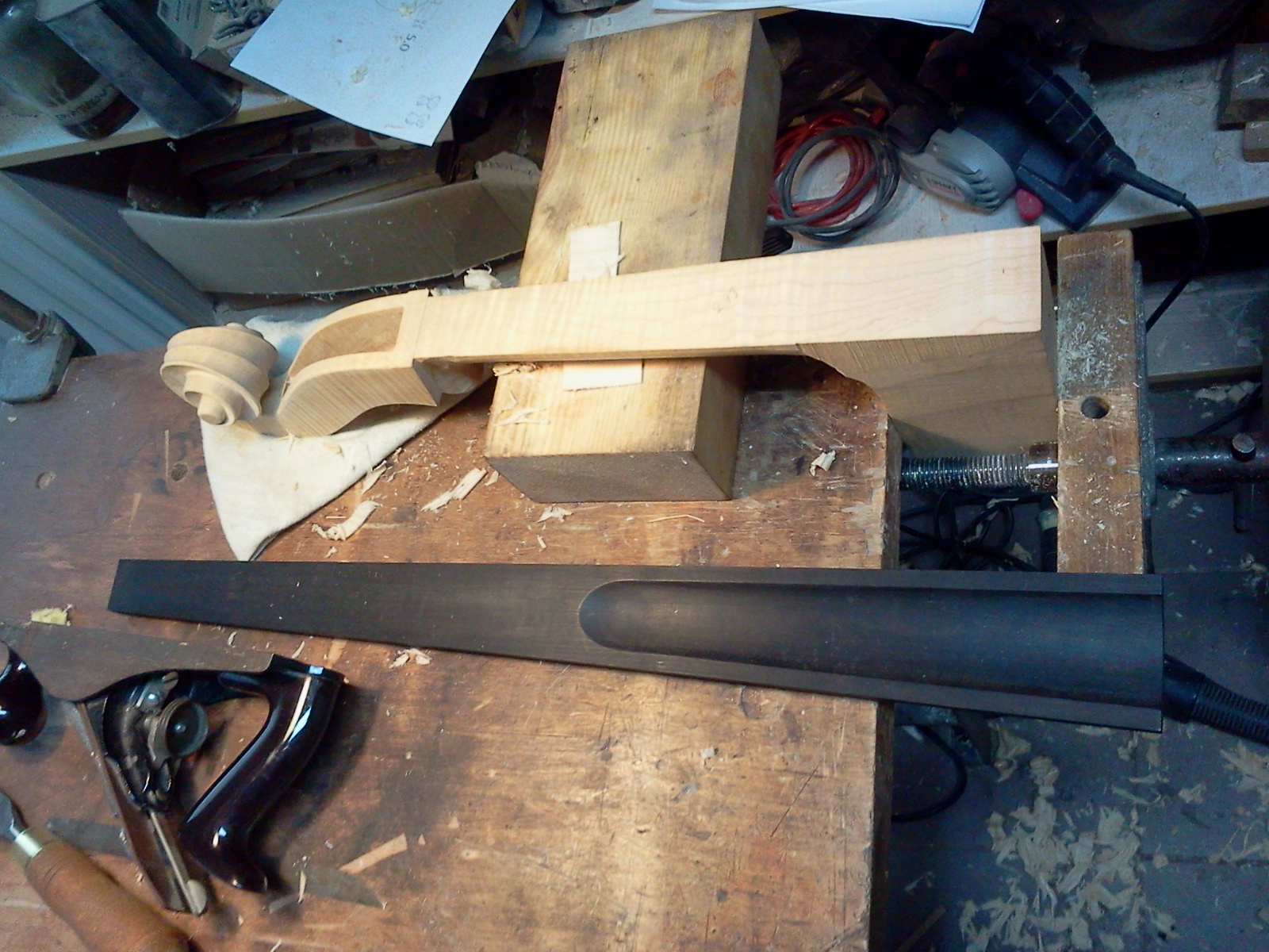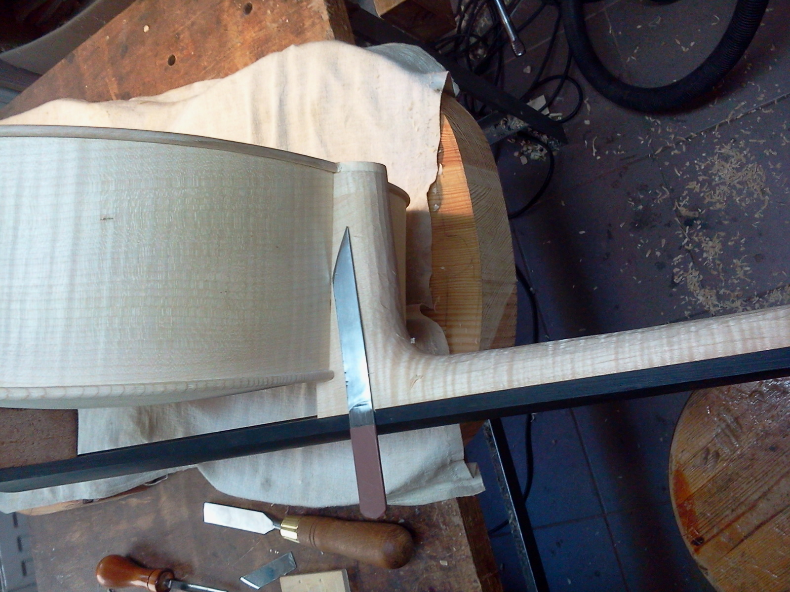 To taki nasz sposub na zabezpieczenie przed wyłamaniem szyjki w razie przewrócenia. Robimy też tak by więcej materiału szyjki wchodziło w pudło. W skrzypcach tego nie trzeba bo to stosunkowo mocne miejsce i prędzej szyjka wypadnie z piętkę. Tak że trzeba o tym pamiętaę przy pasowaniu żyłki w jaworowej płycie by nie wcięę sie tam zbyt głęboko.