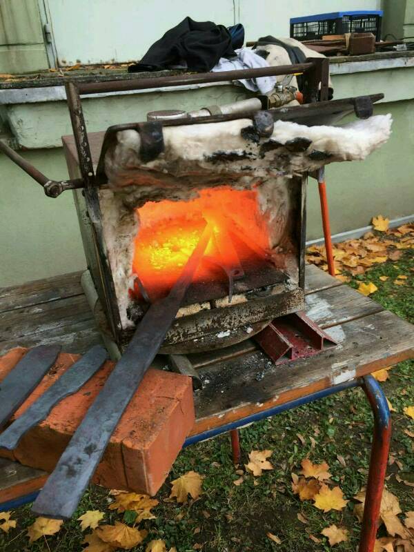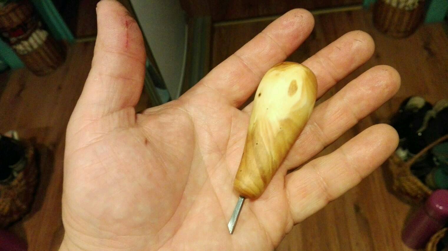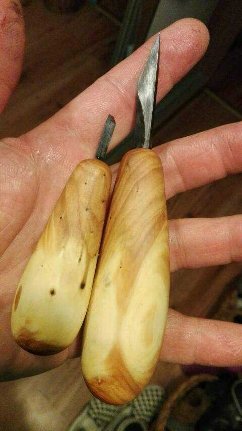 Dłuto i nóż skołczone, odpułciłem w 200 *C w piekarniku i osadzilem na żywicy epoksydowej. Jedno dłuto niestety pękło i czeka na przeróbkę. Nóż jest niesamowicie ostry dłutko też