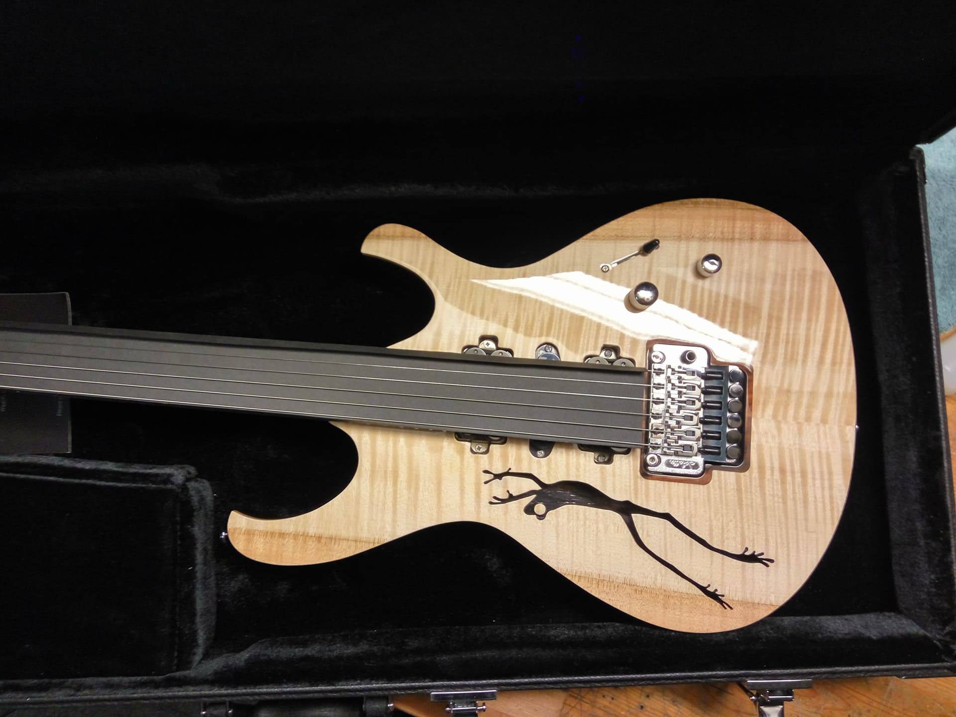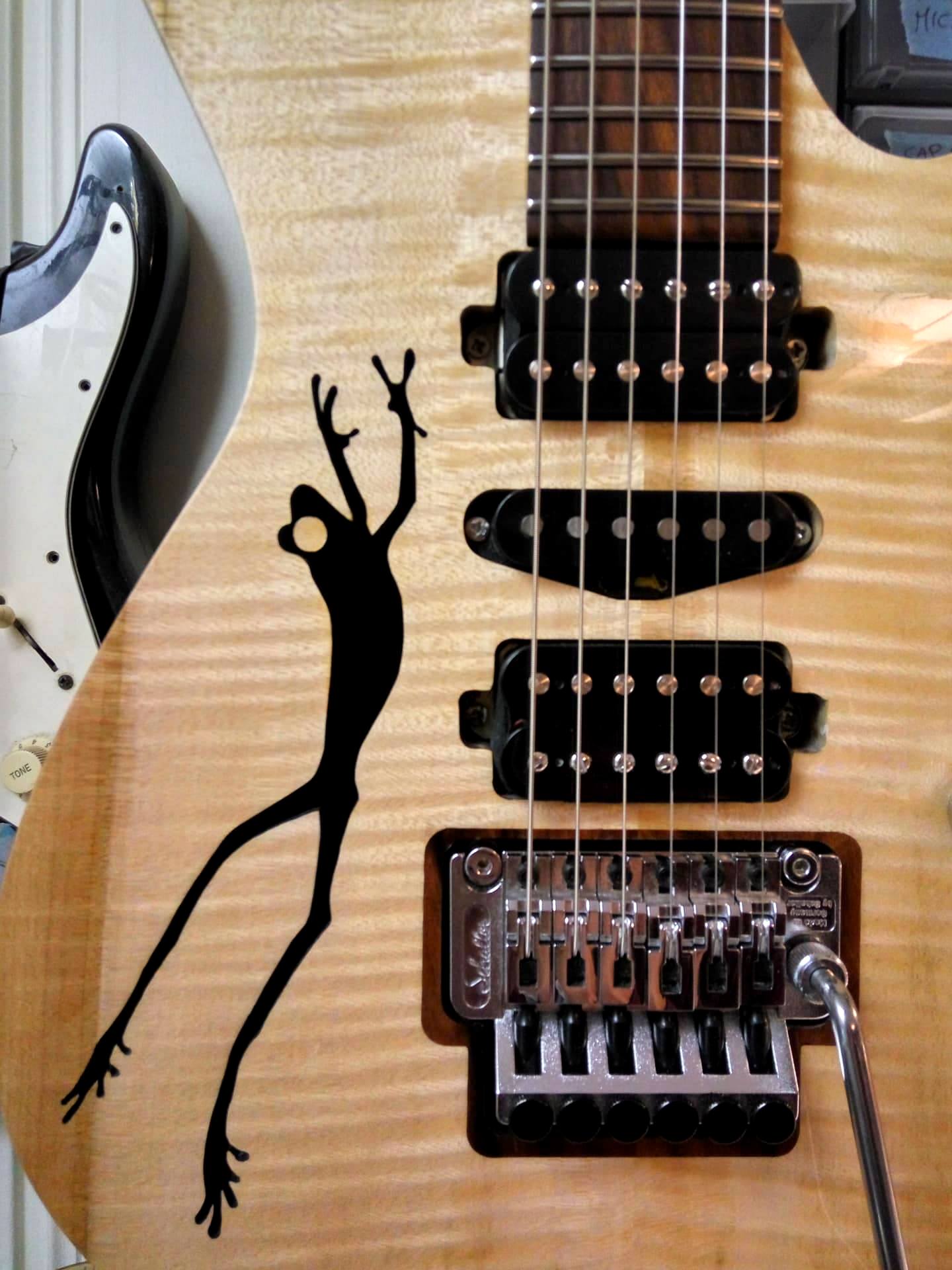 Co to? Mój fusion semi hollow, korpus z niangon-u top jak widaę klon falisty, gryf klon kanadyjski delikatnie falisty, podstrunnica palisander. Mostek i klucze jak widaę schaller, hipshot, progi tytanowe, pickupy moje :mrgreen: Podoba się ? Tak żaba jest wyfrezowana na wylot w topie 8-)
