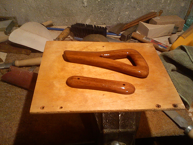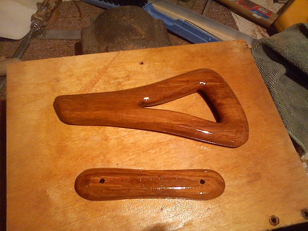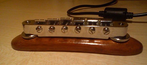 Dwie godzinki pracy i wuala! Strunocięg gotowy. Na badziewnym zdjęciu, które za chiny nie chce oddaę prawdziwego piękna bambusa wyeksponowanego przez pierwszę warstwę lakieru widaę co stworzyłem. Od drugiej strony wyfrezowane miejsce na wklejenie blaszki mocujęcej, wyfrezowany też kanał na beczułki strun. jako blaszke zastosowałem oryginalna ze starego mostka odpowiednio docięta i dogięta