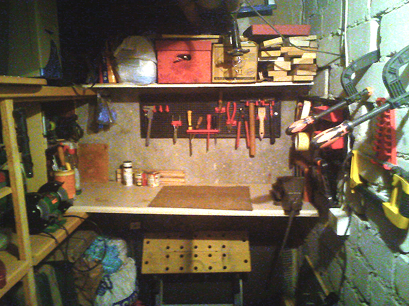A tak wyględa teraz mój skromny warsztacik. Miejsca za dużo nie ma dlatego takie rzeczy jak szlifierka, stojak z wiertarkę czy imadło są ruchome i przykręcane do blatu kiedy zajdzie taka potrzeba. Sę stosowne dziury i łruby przygotowane. Szlifierka niebawem trafi na łcianę po prawej - jest tam miejsce, Tylko kupię uchwyty do półki