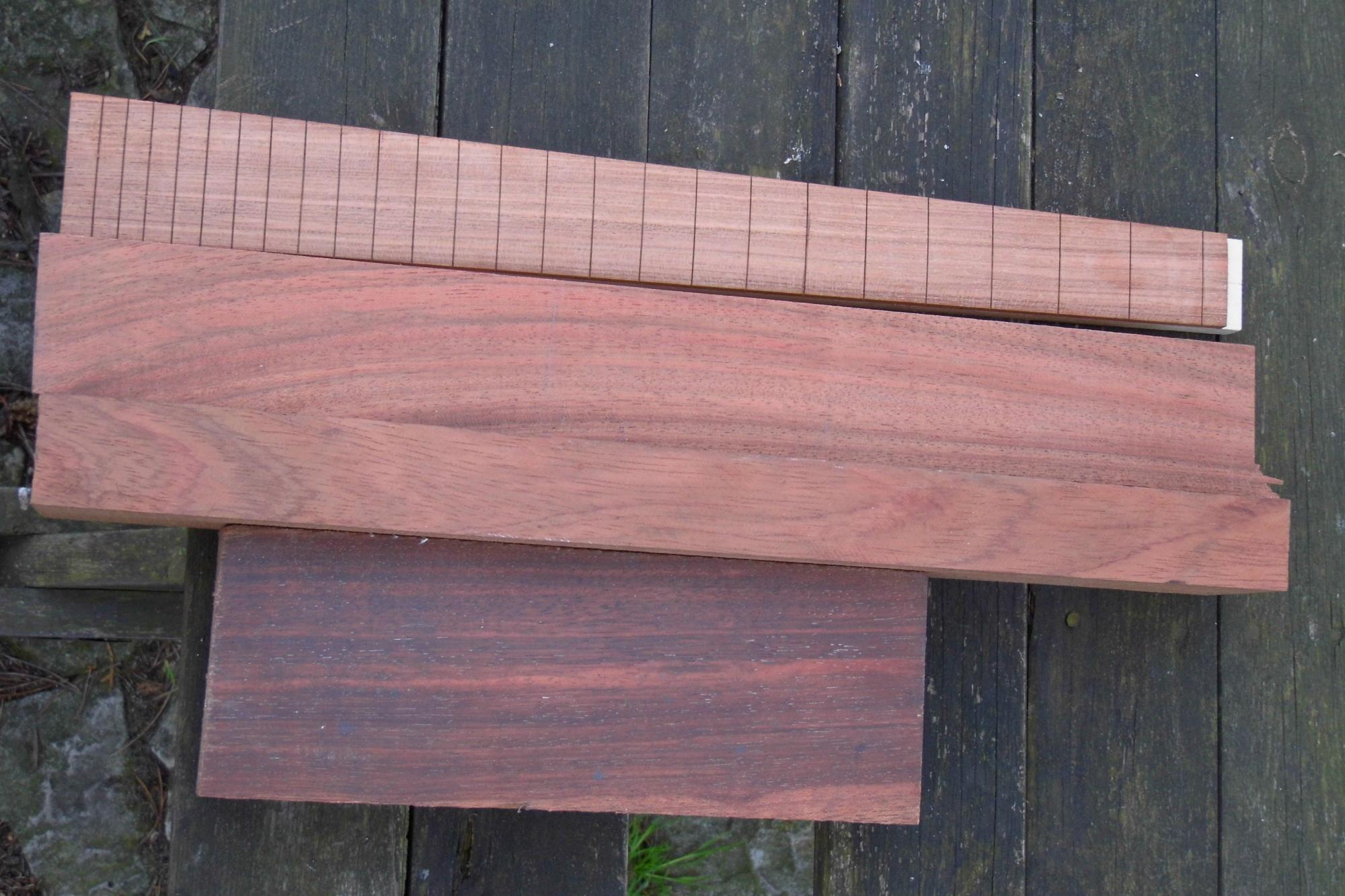 witam. mam problem z identyfikację drewna na zdjęciu jest jedna deska pocięta. od góry -surowa podstrunnica to łwieżo odcięty kawałek potem są dwa gdzie już minęł jakił czas i łciemniały i nabrały bardziej czerwonego koloru i na kołcu pomalowane lakierem. drewno jest dołc porowate a paznokieę pozostawia takie same wgłębienia jak w sapeli.